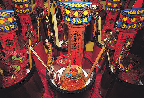 During this month, given that the ghostly gate is opened, the main altar is arrayed with over 60 sacred Dipper lanterns, bushels filled with white rice, rulers representing safe passage through good times and bad, a balance, a demon-dispelling sword, a spirit mirror, and other exorcistic implements. These symbolic objects are used to safeguard those involved in the pudu rites. During the festival, the Dipper lanterns must be kept constantly burning. They must never be allowed to go out.