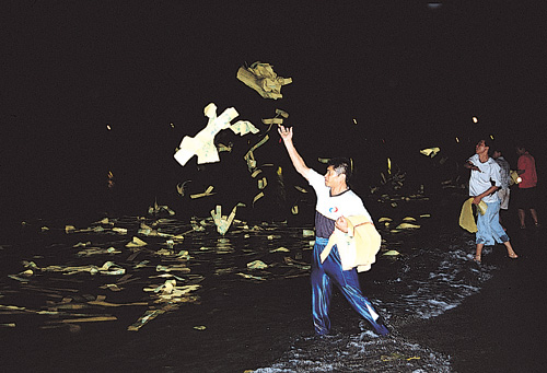 The wet Ilan region tends to be unpredictably rainy. At the point where Tetzukou Creek reaches the ocean, 50-odd water lanterns have been filled with spirit money. In the rain, the ritual master leads the people in casting paper printed with representations of clothes, combs, and shoes out to sea. Yellow spirit money flutters in the rain-streaked night, then rises and falls with the waves. One can imagine ragged, watery souls reaching out for the offerings, then arraying themselves properly to step onshore.