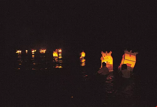 To prevent the turbulent waves from overturning the water lanterns, the organizing committee has acquired the voluntary services of a group of capable young swimmers. In the dark night of this ghostly month, these swimmers guide the lanterns one by one to sea. "Look, the first lantern has made it out to sea!" cry out the spectators with joy and relief as they peer out into the distance towards the barely visible lanterns.