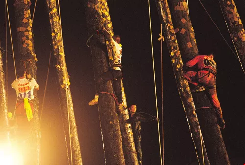 Moreover, this year's ropes are shorter and stiffer than those given out at last year's competition. None of the teams makes it up during the first round. One team even withdraws out of exhaustion. A climber falls off a pole onto the safety net, but fortunately is uninjured.