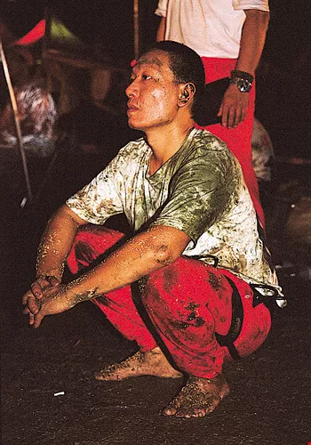 After the competition, competitors crouch panting, their bodies covered with tallow.