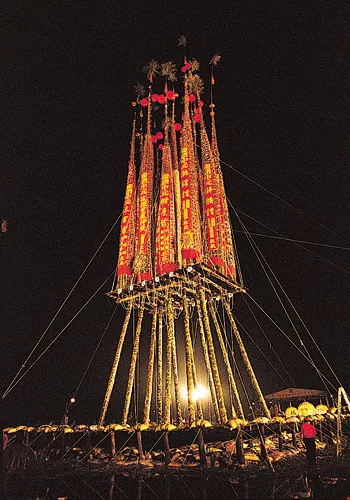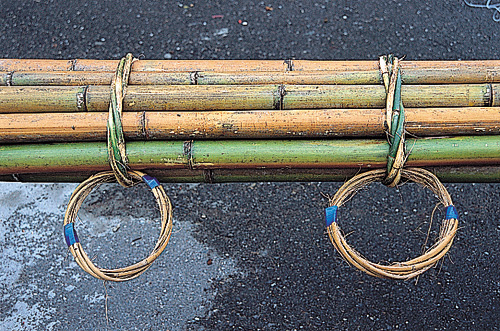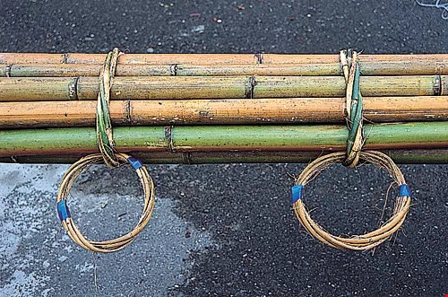 Thirteen poles are set upon the square platform, formed by lashing together fir and bamboo into a conical shape. Near the top, bamboo rings serve as handles for the climbers.