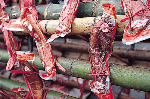 To the bamboo atop each pole are attached silver spirit money, a chicken to ward off evil, and at the very top a fine, woven "favorable wind" flag. According to tradition, once when a group of fishing boats at sea were caught in a typhoon, some were lost, but those bearing the "favorable wind" flag returned home safely. To the fishing community, the flags thus stand as a much-coveted symbol for good fortune and the safe return of the boats. Woven by renowned artisans, they are worth several tens of thousands of NT dollars each.