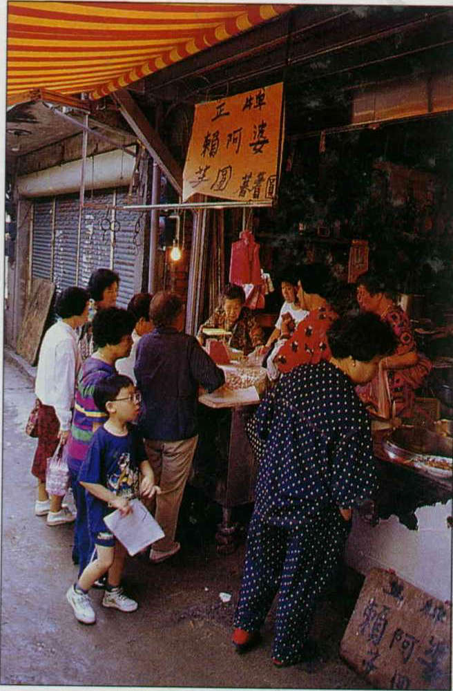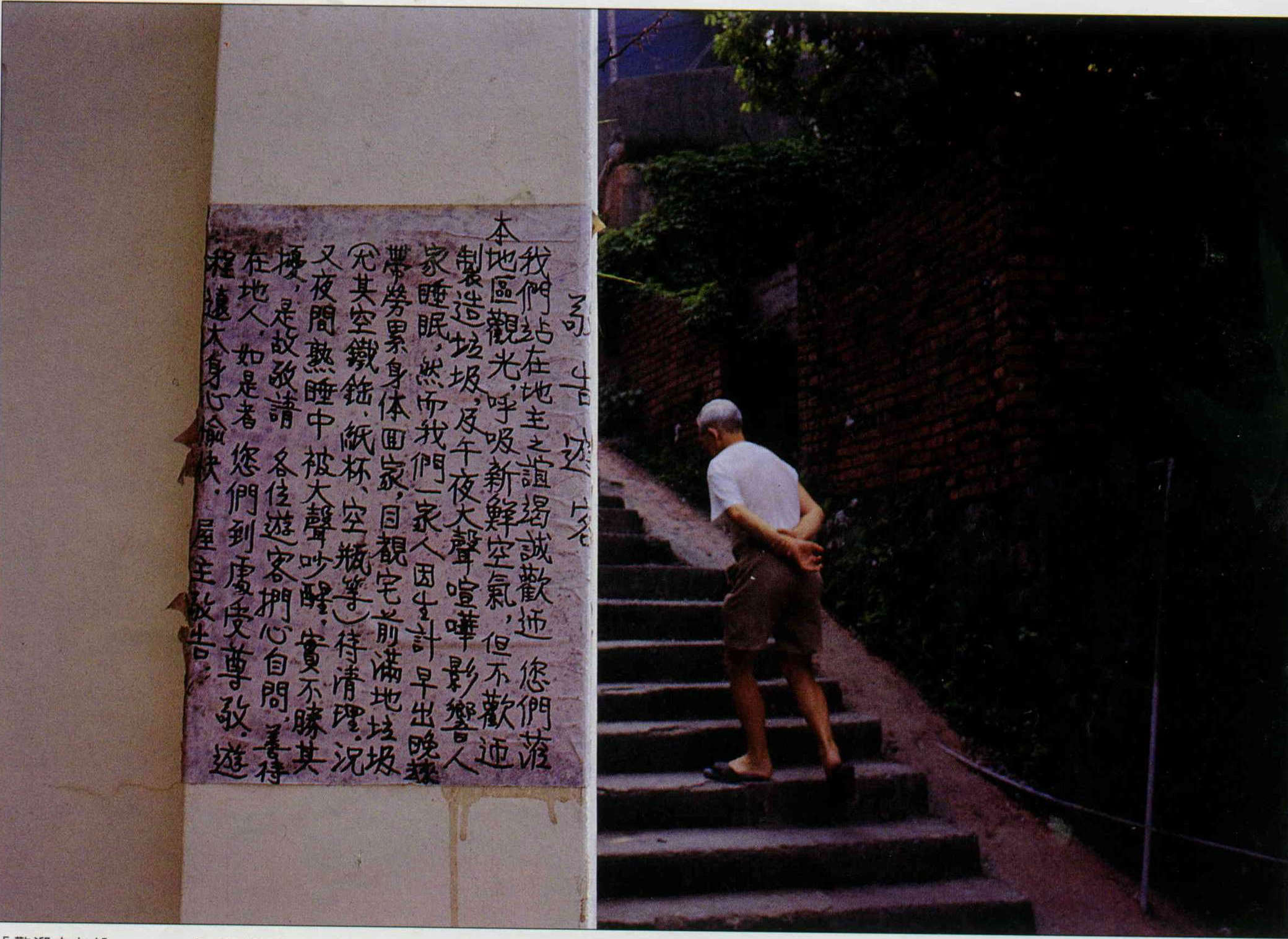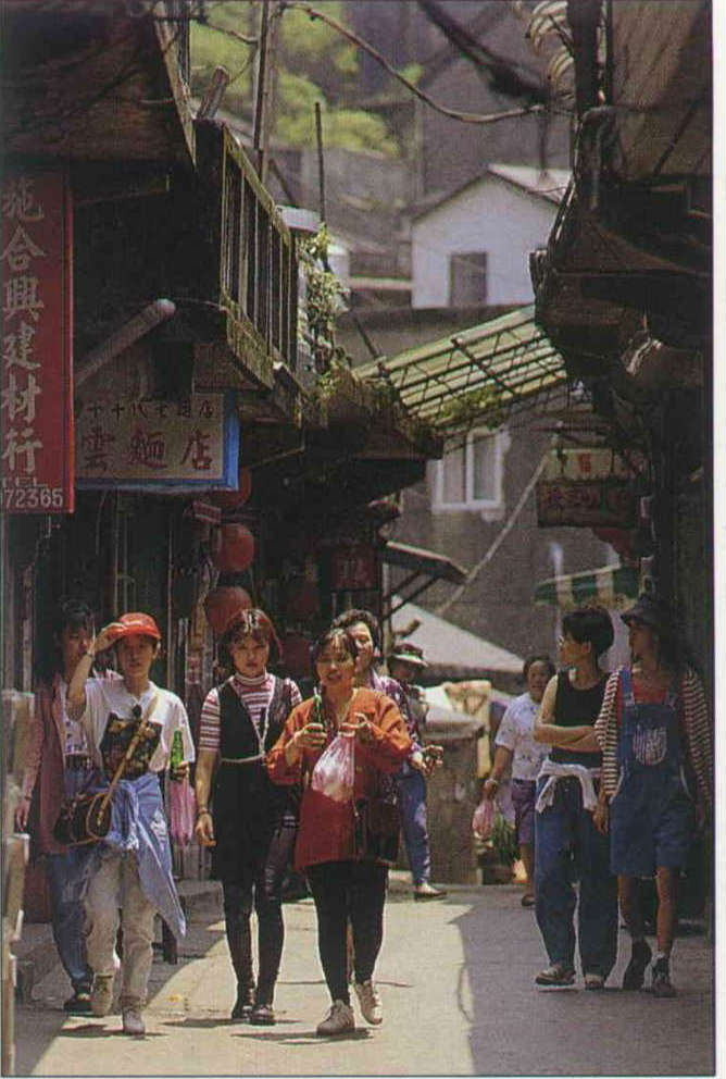 On the wall outside of a house on one of the old streets there are sixteen large red pennants with characters written on them. The upshot of all the writing is this: "Welcome to Chiufen, but the noise and garbage generated by all the tourists has ruined the lives of the residents . . . ." This protest, expressed in mild and polite terms, is replete with a sense of frustration. But it seems that protests are only of limited value. Kids still throw their soda cans about, and their boom boxes are turned up full blast as they wander up and down the street showing off their "coolest" look.