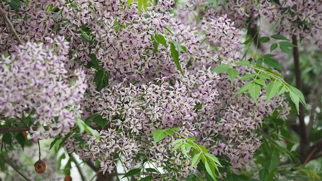 The chinaberry, a native Taiwanese species, flowers around Tomb Sweeping Festival, covering its branches with pale purple blossoms.