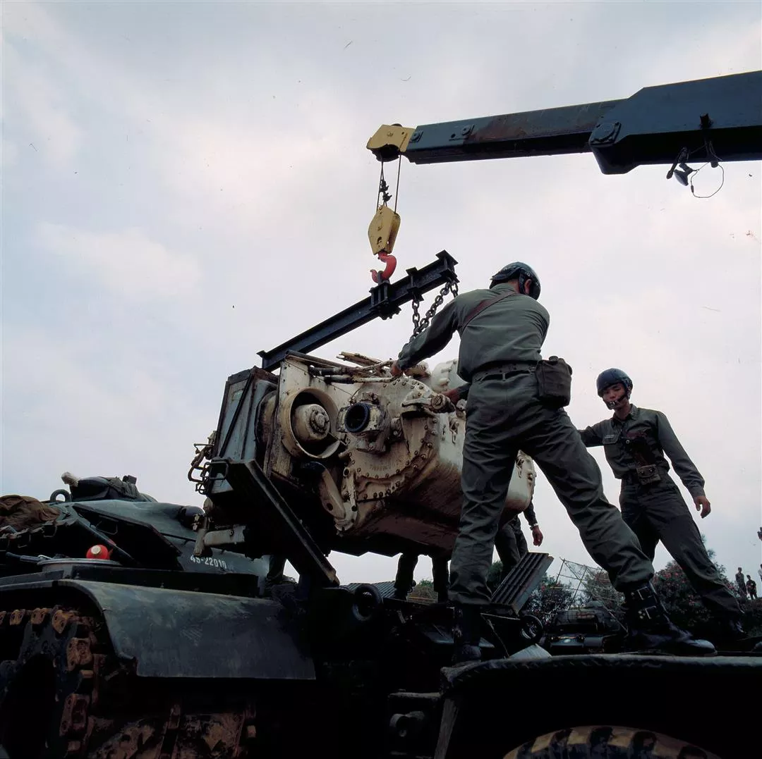 1. The tank unit which has been chosen as Chu Kuang Lien Tuei in the army sector. 2. & 4. The armed forces attach great importance to the maintenance of equipment. 3. In combat maneuvers, tanks advance amid clouds of dust and smoke.