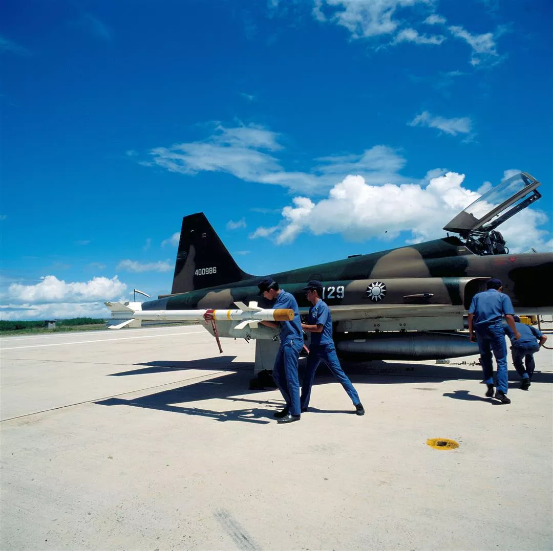 Officers of the Air Force Chu Kuang unit installing missiles on the F-5E jet fighters.