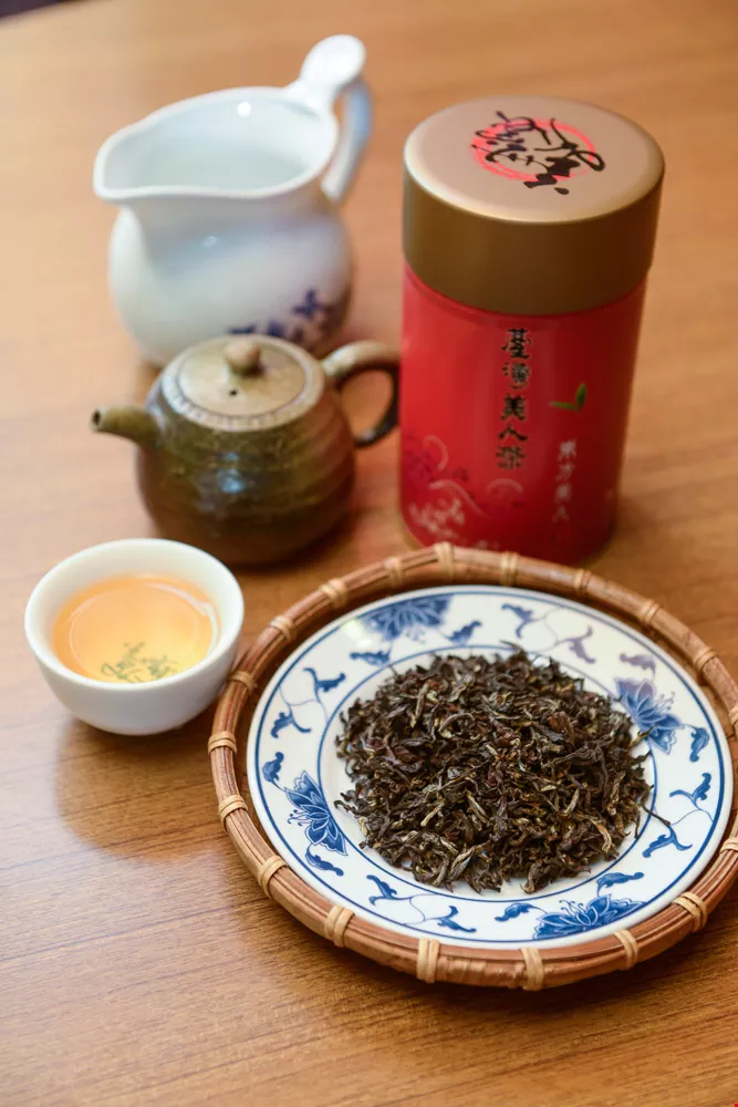 Oriental Beauty tea is made from leaves infested with an insect pest, the tea green leafhopper. As a result, the tea develops a unique aroma not unlike slightly overripe fruit.