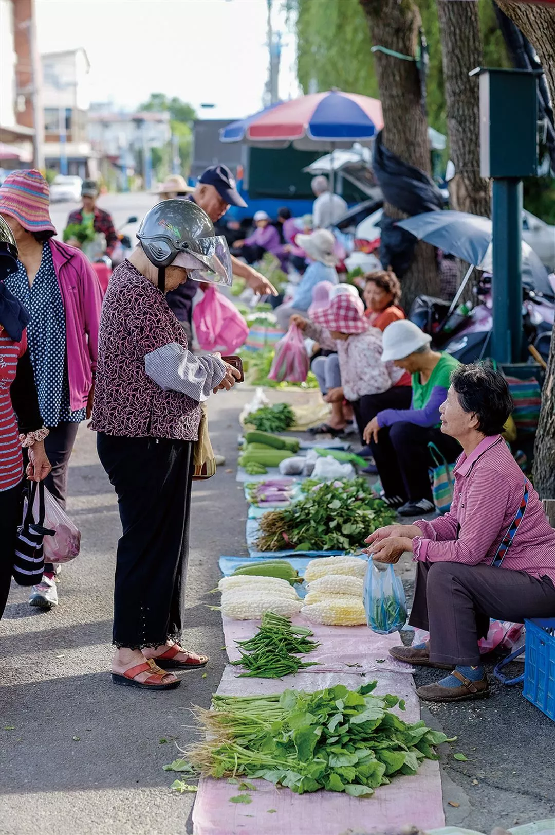 By around 6 a.m., there are a number of older residents selling home-grown organic vegetables on Guangfu Road. They sometimes exchange produce, a bunch of bok choy for a bunch of Chinese kale.