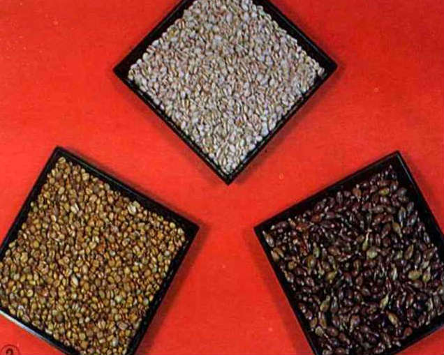 2. Illustrated are three different types of pearl barley seeds. On top is the shelled, white seed kernel, to the right the wild variety, and to the left the cultivated variety.