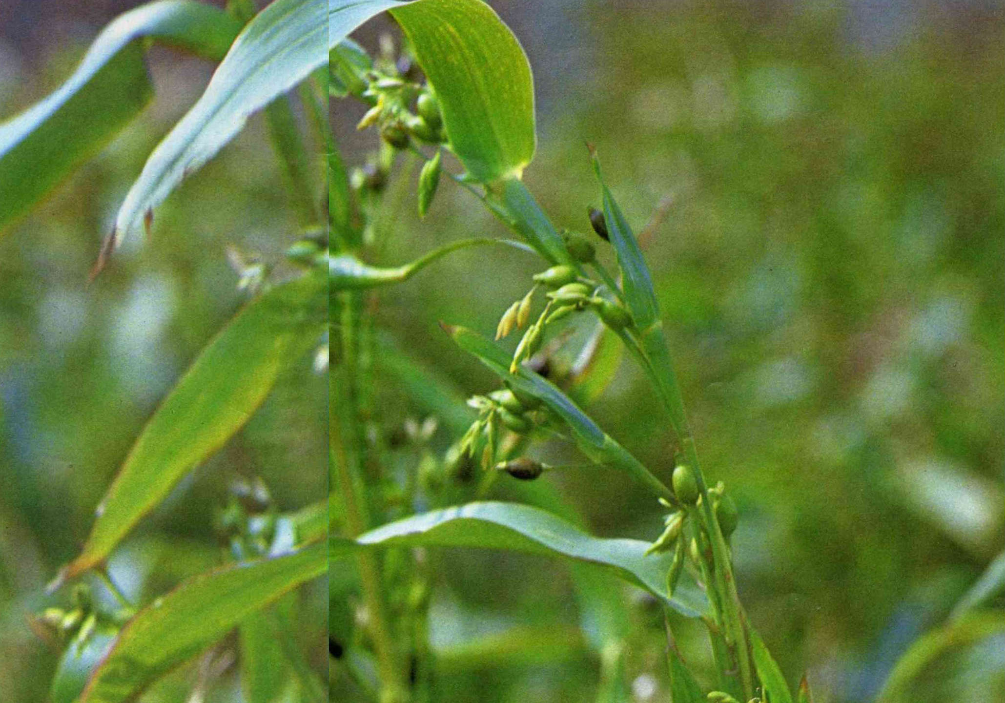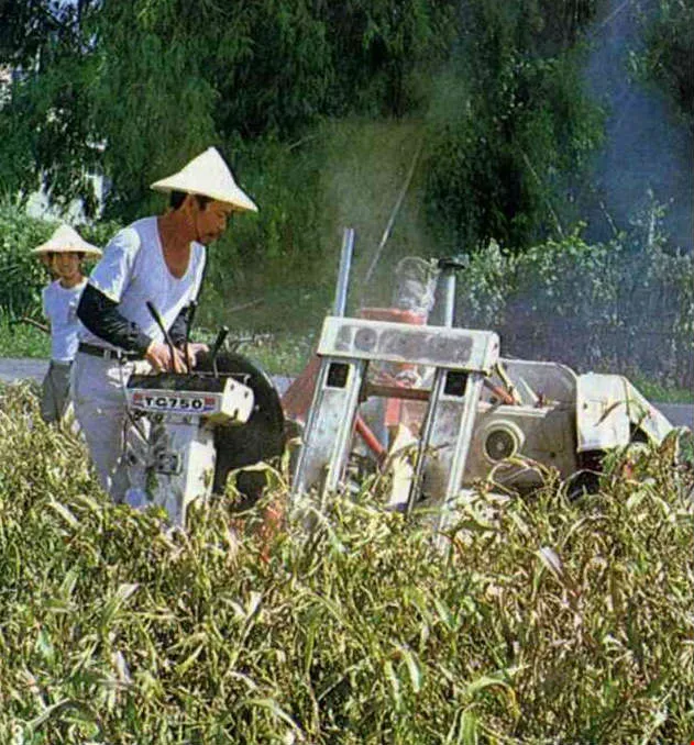 1. The process of transplanting pearl barley seedlings is similar to that for white rice. 2. Illustrated are three different types of pearl barley seeds. On top is the shelled, white seed kernel, to the right the wild variety, and to the left the cultivated variety. 3. A farmer uses a reaper to cut barley stalks. 4. Barley is a member of the grain family, similar in appearance to rice. 5. Pearl barley is a key ingredient in "Four Miracles Soup".