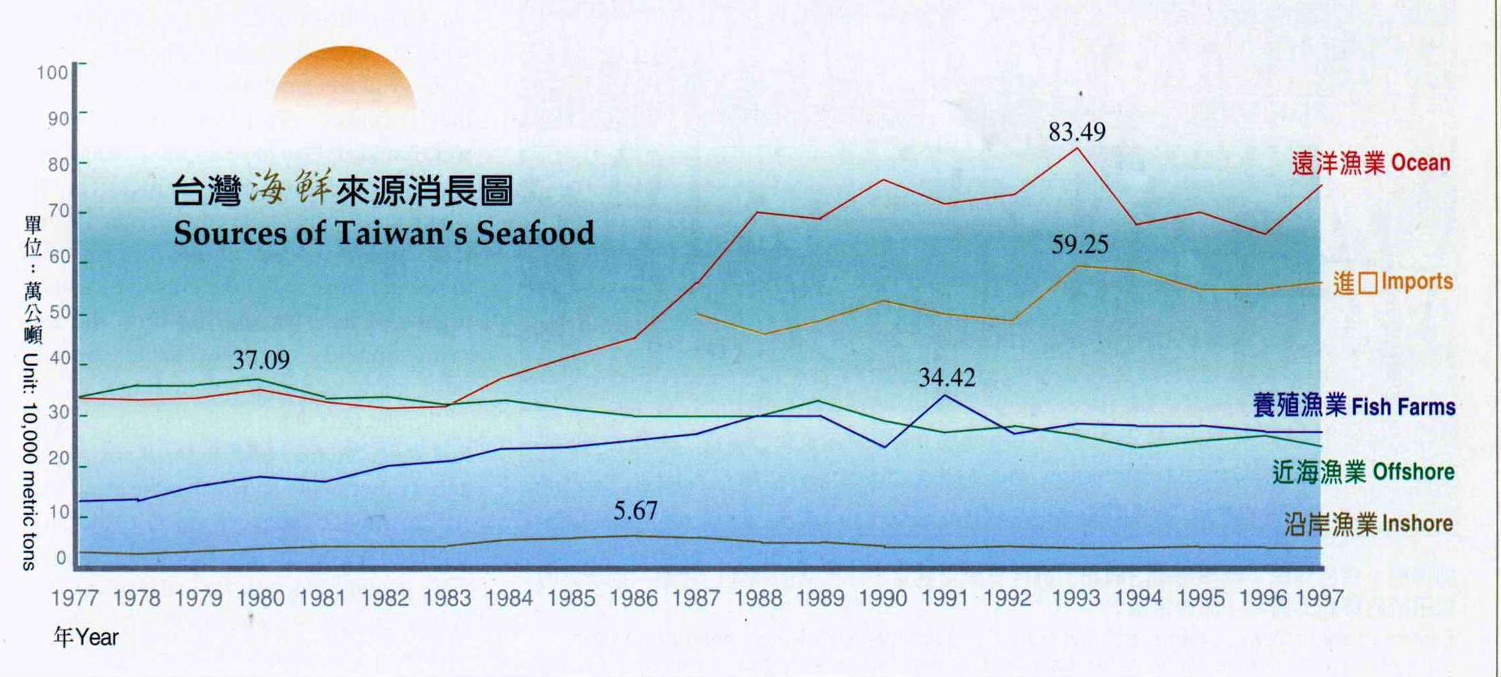 Over the last decade, the coastal fishing catch in Taiwan has steadily declined. "In particular, bottom-dwelling fish, which have the most economic value and are most popular, have been the earliest to be exhausted," says Hu Sing-hwa of the Fisheries Administration of the ROC Council of Agriculture. Sea floor tow-nets damage the ocean bottom and lead to overfishing, so the catch from tow-nets has fallen considerably. In 1971 volume was about 180 kilos per hour, while by 1991 it had fallen to 80 kilos per hour.