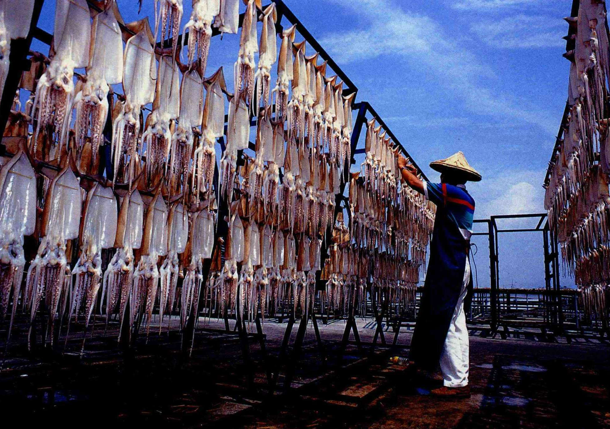 Not only have fishing vessels increased in number, but large-scale fishing boats have greatly strengthened the ability to catch fish on the distant high seas. For example, the most effective type of net, the purse seine, began to be used in 1982, and by 1991 there were already 44 ships using it to catch bonito, tuna, and other migratory fish. People began to widely consume canned tuna, tuna salad, and tuna rice rolls (fantuan). In the early years, Taiwan had to import most of its squid from Korea. But Taiwan began to develop squid hook technology in the 1970s, and today, Taiwan's squid catch has reached 210,000 metric tons. Squid caught by Taiwan boats is now sold overseas, and street vendors everywhere sell squid stew and barbecued squid. In addition, it is dried to make shredded squid strips, which are a delight for travelers and hikers.Stinking head and rotten guts