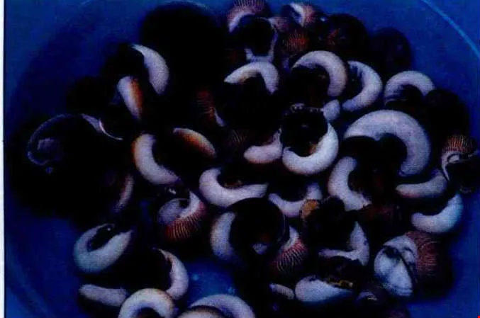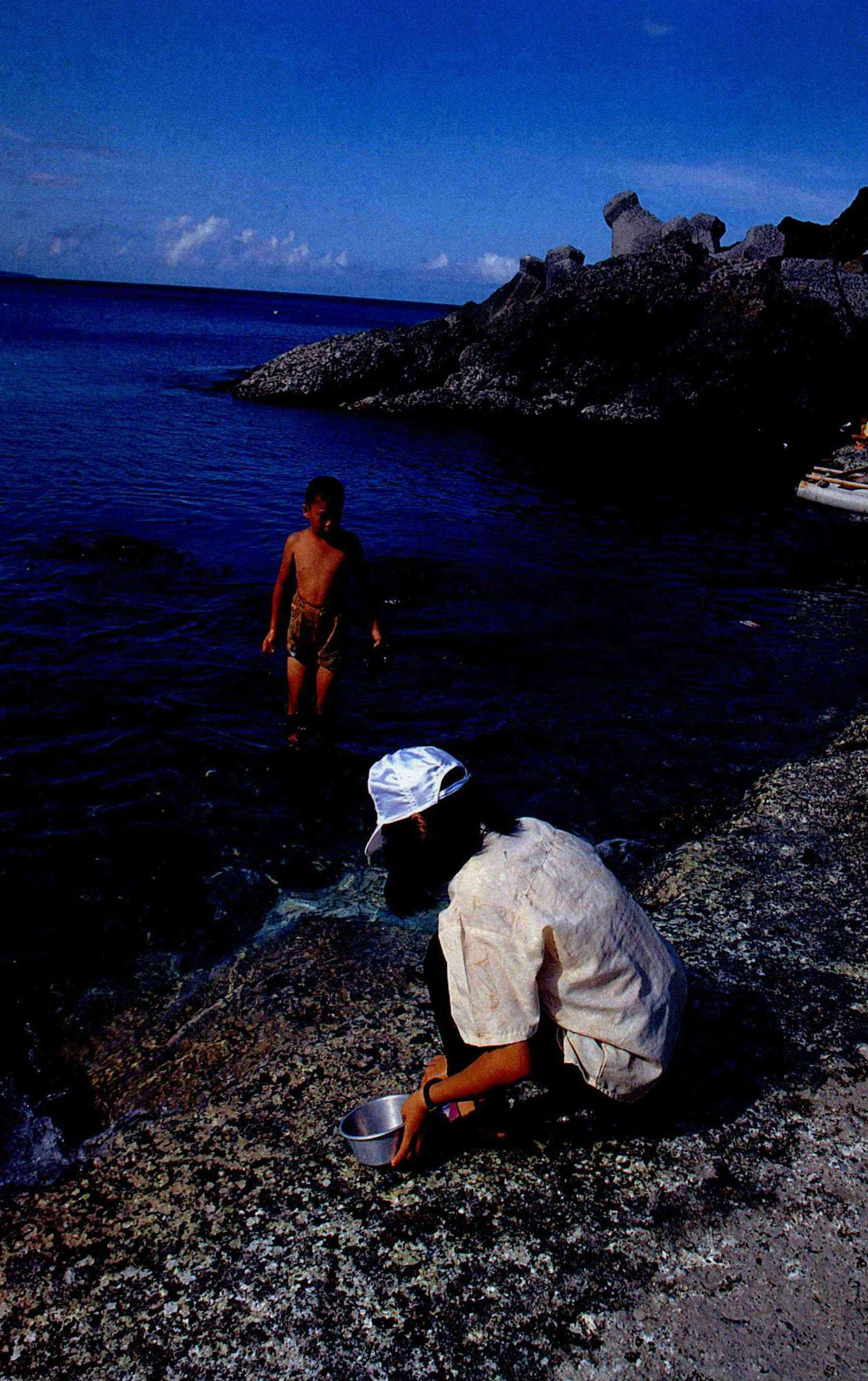 If you had no money to buy seafood, you could catch it yourself. Children along the West Coast of Taiwan searched the flat sandy beaches near the mouths of rivers for the telltale sign of a buried clam-two little mouth tubes sticking out-which they dug up by hand. Women and children along the Northeast Coast took advantage of low tide to seek top-shells.