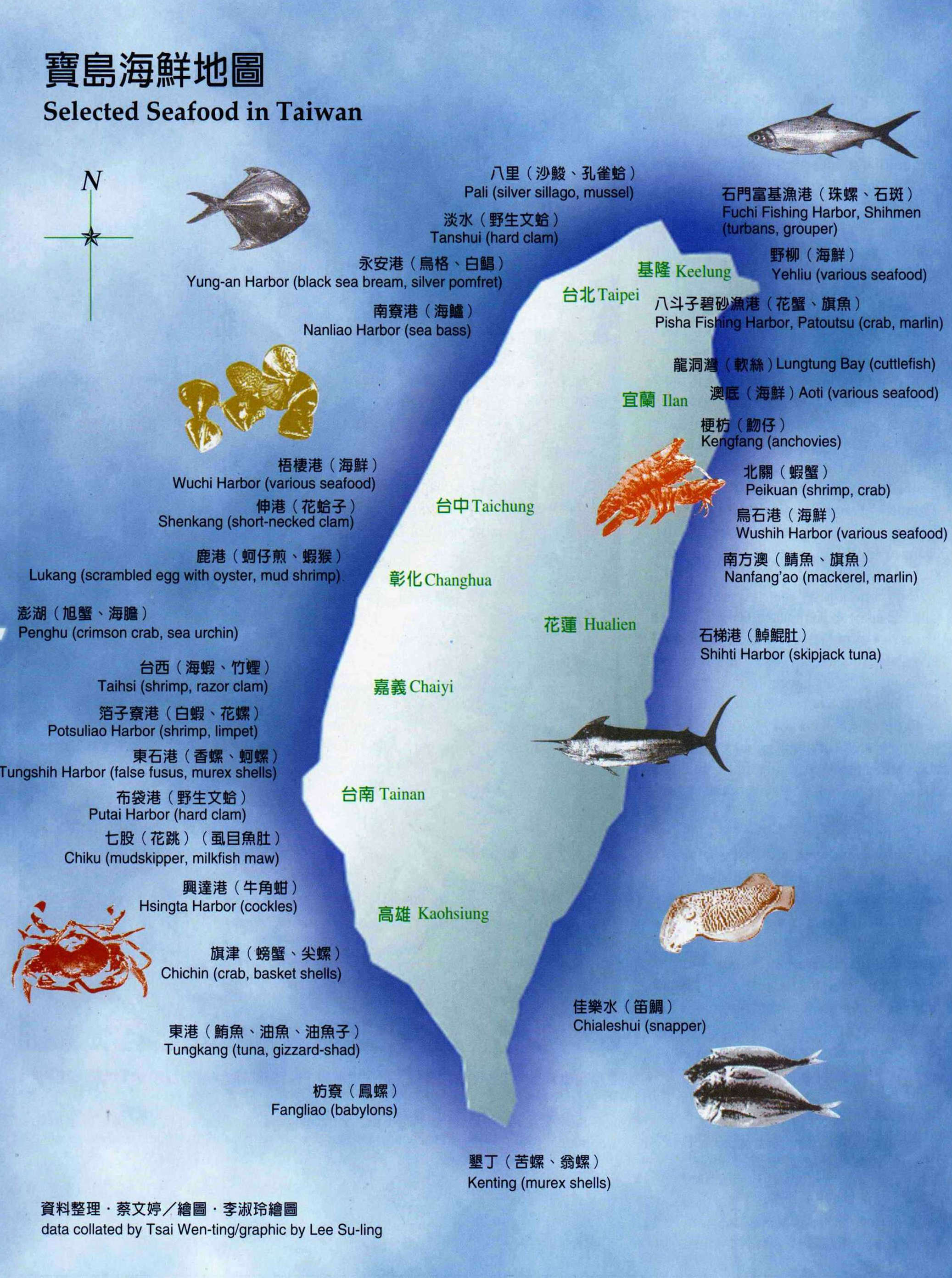 Open up a book of Taiwan seafood recipes or maps of Taiwan fishing grounds, and you will find crimson crab from Penghu, mackerel from Nanfang'ao, milkfish from Tainan, and sashimi from Tungkang. At high-grade banquets there's everything you can imagine, from Norwegian salmon and Thai shrimp to French raw oysters and Japanese-style "ice fish." No wonder seafood gourmands declare that this is the best of times for seafood-lovers.