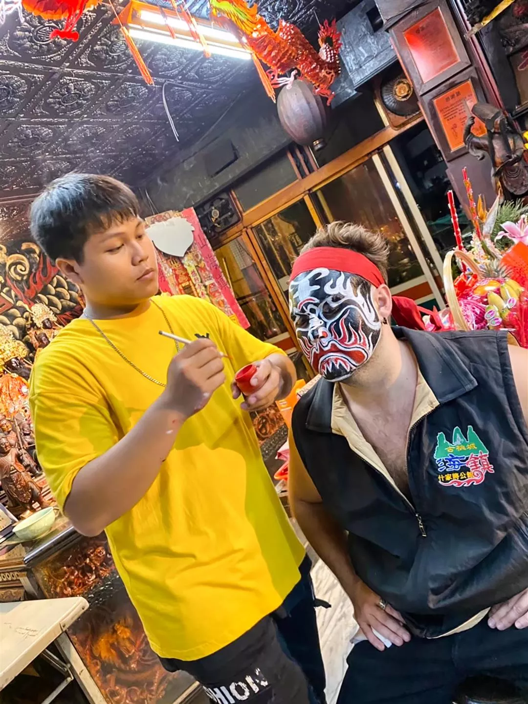 His love and understanding of Taiwan’s religious culture saw him invited onto the show God Bless Baodao to take part in the Baishatun Pilgrimage and to join Chiayi Shenhaizhen Temple’s Shejiajiang procession (a variant of the “Eight Generals” procession). At that time, he first cast an oracle to obtain the temple lord’s consent, after which he ate vegetarian food for nine consecutive days as is customary and then took part in tīn-thâu array practice. “My thighs hurt so bad!” he says, slapping his thigh and smiling. For formal tīn-thâu performances, makeup is applied to the face to invite the gods into the body, and Giovannetti’s fellow group members told him he was the first foreigner in Taiwan to go through the process.