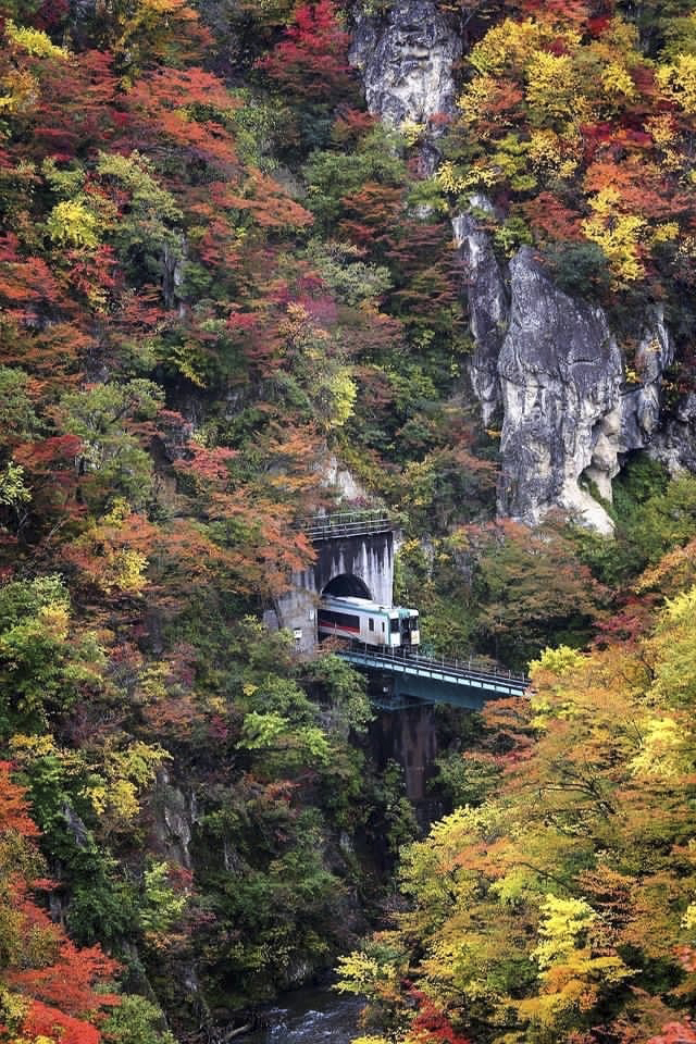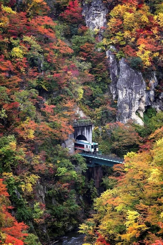 The Naruko Hot Spring, located in Miyagi’s Osaki City, has beautiful autumn colors during the maple leaf season, from mid-October to early November. Following in the footsteps of Matsuo Bashō, the famous 17th-century haiku poet, visitors can walk the Oku no Hosomichi (“Narrow Road to the Interior”) path and try their hand at painting kokeshi (simple wooden dolls). Finally, they can head to the hot spring street to bathe.