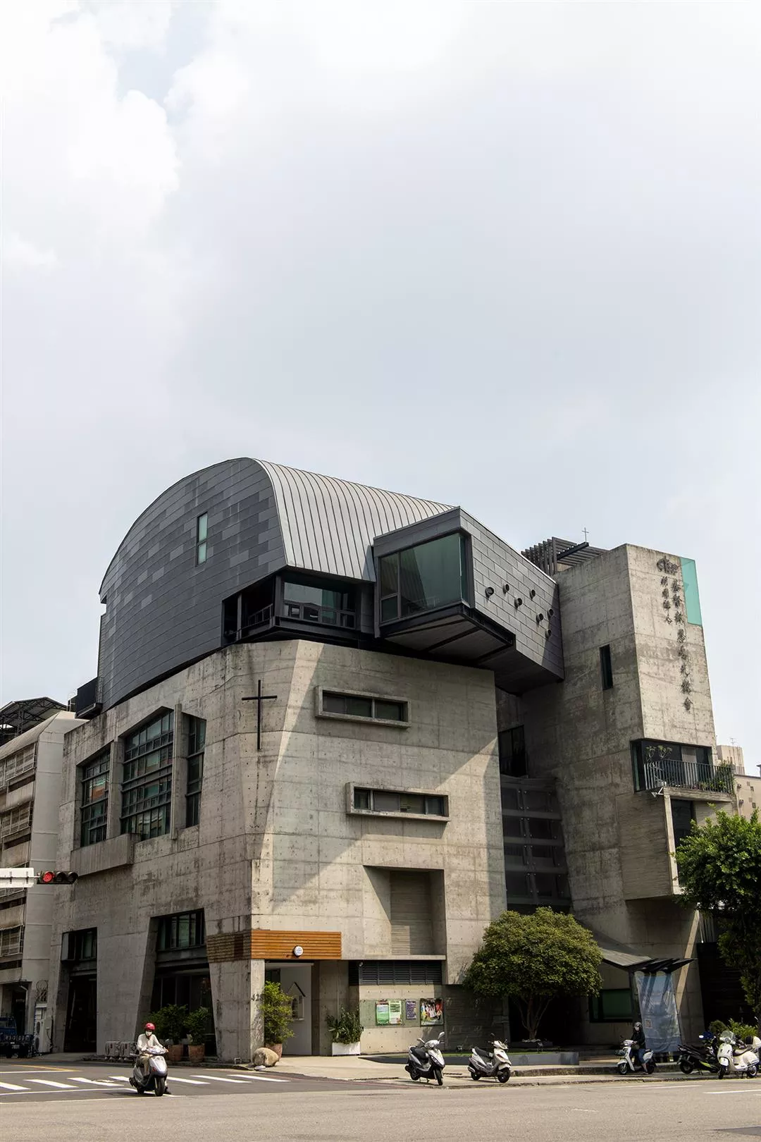Light of Christ Salvation Church in Taichung’s North District is located in a place where residential properties mix with commercial premises. The first four levels of this church have a facade of unpretentious béton brut. Above, a cantilevered passageway protrudes from the main building, providing a link to an ark-shaped structure. Clad in dark-gray titanium–zinc sheets, this upper part of the building may remind us of the illegal rooftop structures common in Taiwan, but it is in fact where worship takes place. Referring to his design, Liao tells us that for him Taichung is a city that lacks context, and he has taken up the challenge of helping a building show its identity in a modern city like this. Situated at a road junction, the church gives expression to the architect’s experimental thinking: If we look at it from a distance, we will notice that the main worship space, which has the appearance of an added rooftop structure, actually blends in perfectly with the vibrant, if somewhat cluttered, streetscape, even while it displays its own character. The architecture attests to the “identity” that Liao wishes to bring out.