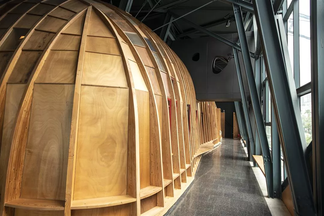 Guided by light into the main worship space, you’ll be startled by the atmosphere. In Jiaoxi Presbyterian Church, this is located on the second floor. The structure here again has a double skin design, comprising a light steel frame on the outside, which is a common sight in Taiwan, and a domed interior space made of laminated wood. This oval inner structure has irregularly spaced windows through which light streams in, reminding us of biblical references to prayer and worship in woods and wildernesses.