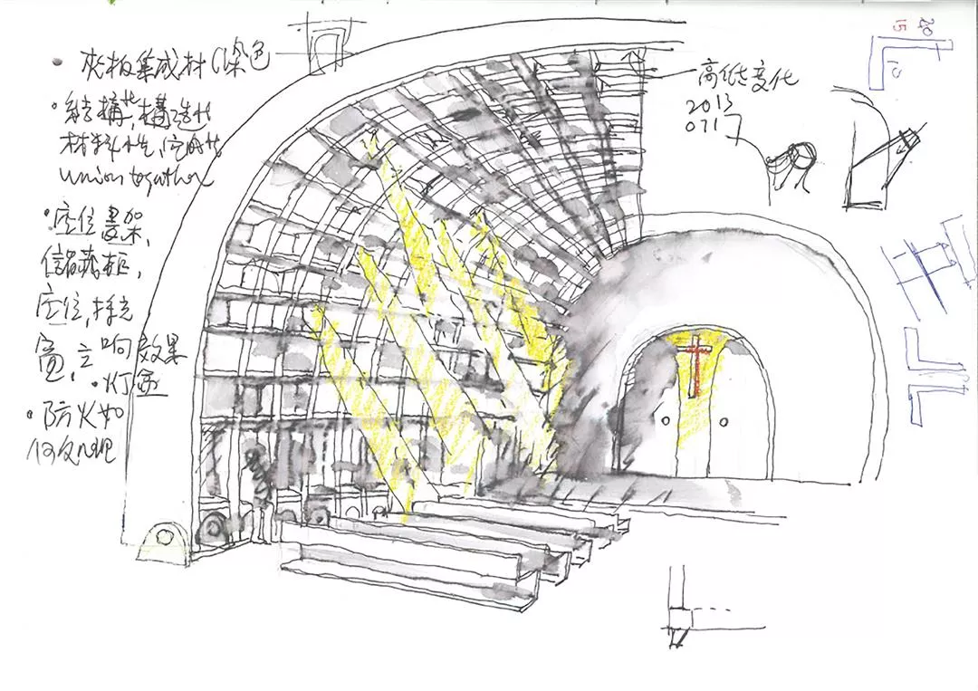 Liao strongly recommends that we ascend the stairs slowly and carefully. We are guided by light while walking through these long passageways and staircases. “Of all things in the physical world, light is closest to the Godhead,” Liao says. In the case of Deguang Presbyterian Church, natural light shines upon a cross made of steel bars—it greets you as soon as you come into the building. This church also features irregular openings in the walls, and even gaps between segments of the walls, through which sunlight enters, evoking different moods at different times of the day and in different seasons. “I want us to be able to encounter the Godhead in every corner of the place,” Liao explains.