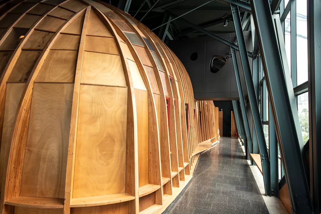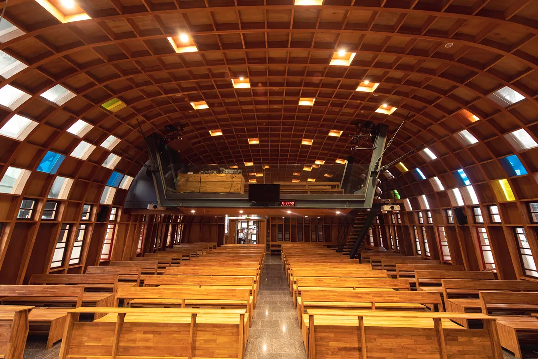 The main worship space of Jiaoxi Presbyterian Church in Yilan has a “double skin” design, comprising a domed structure built of laminated wood inside the building’s outer shell. Light penetrates it, putting us in mind of biblical references to prayer and worship in woods and wildernesses.