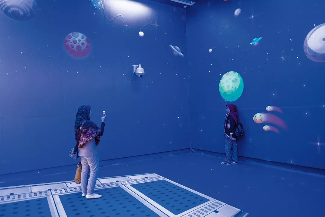 Migrant workers take commemorative photos in the public installation art space in an underground mall near Taipei Railway Station.