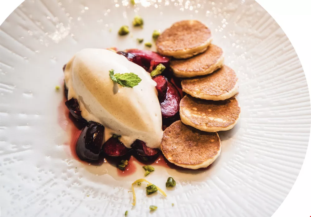 Caramelized banana ice-cream with buckwheat pancake and berries compote.