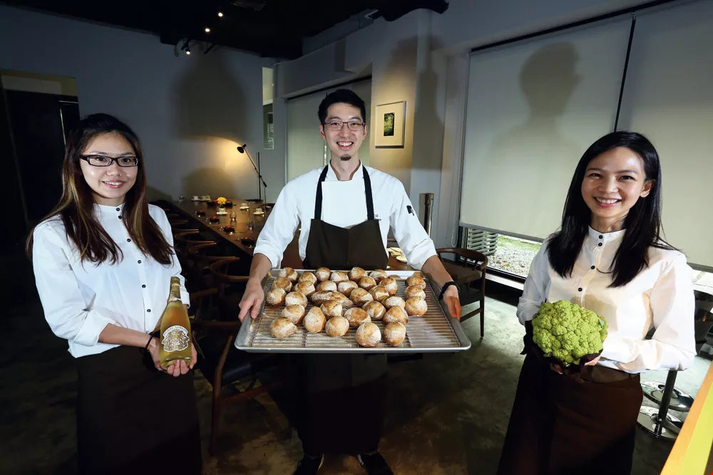 The young staff at the private kitchen Savor are full of enthusiasm, and head chef Zhang Lige (center) makes the entire full-course French meal—including the bread and the dessert—himself.