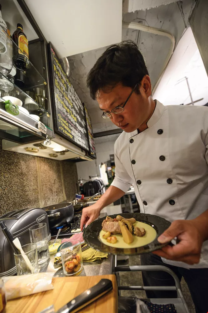 When Zhang, now 30, was 22, he felt “If I don’t do it now, I’ll regret it.” So he forsook his acceptance to a US master’s program in hotel management and enrolled instead in the famous Ecole Supérieure de Cuisine Française in Paris for a year’s training as a chef and a subsequent internship. After he returned to Taiwan, he experimented with cuisine, using his own home as a pop-up restaurant. With two stoves and a small oven, he produced exquisite, labor-intensive French cuisine.