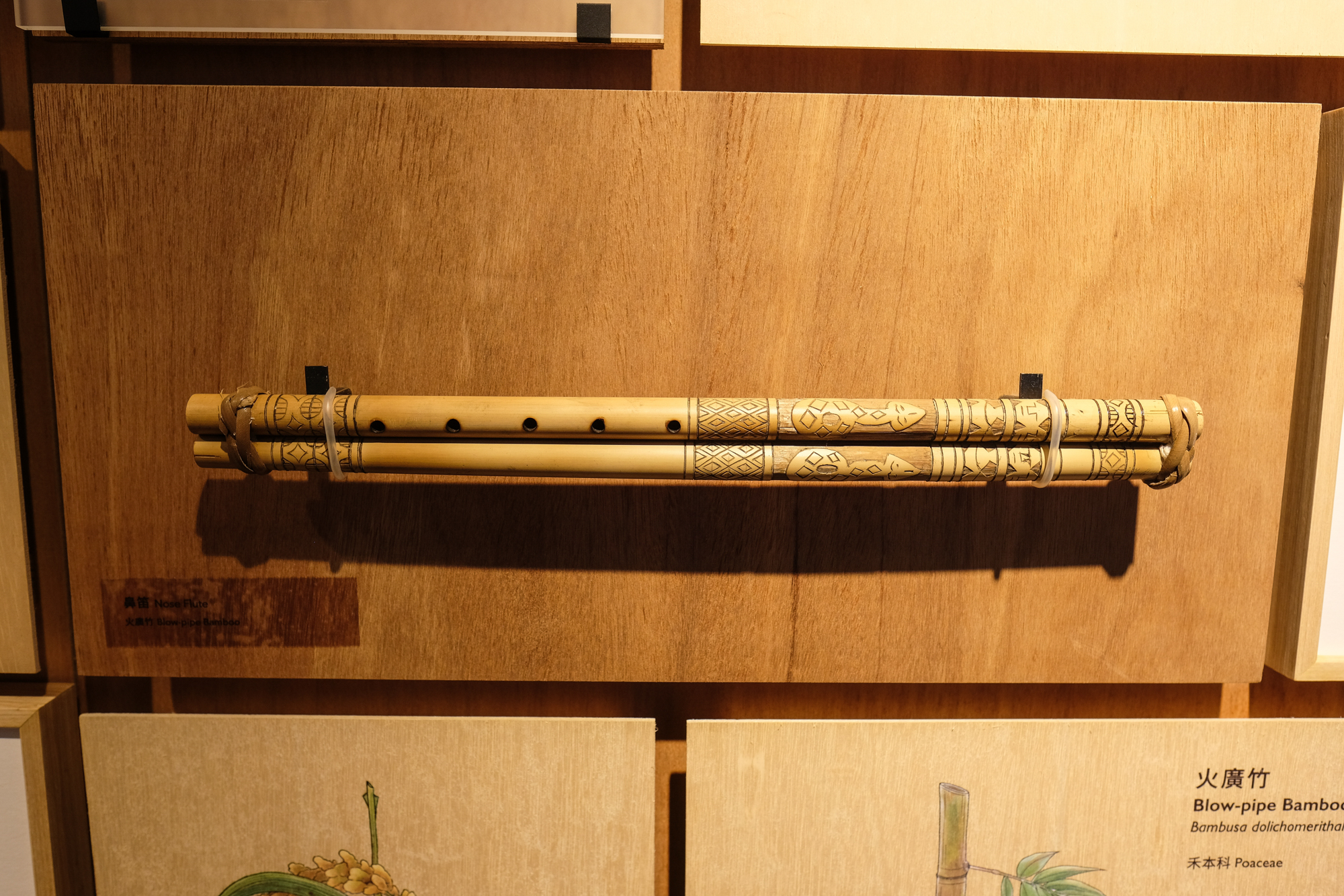 Chung Ping-hung is the owner of Archicake Design, whose team designed the exhibition “Original Mountain Feast.” He hopes the exhibits will give visitors a deeper understanding of the relationship between plants and folk traditions. Therefore, he says, “We decided to display plants and works of art directly.” Items include bags woven from ramie, necklaces made with Job’s tears as beads, and hats woven from yellow rattan (Calamus quiquesetinervius). The EFFEC even invited the Paiwan nose flute master Pairang Pavavaljung to make a nose flute from blowpipe bamboo (Bambusa dolichomerithalla). The flute is inscribed with images of the hundred-pace snake (Deinagkistrodon acutus), which is a symbol of noble families, and with human figures.