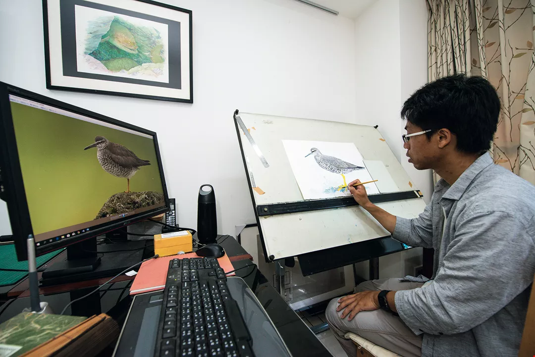 Working from a photograph, Li Cheng-lin captures the details of a bird’s appearance.