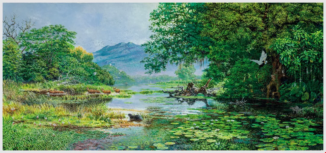 For the setting he chose the landscape of Shipai, an area in modern Taipei’s Beitou District. He adorned this landscape with the nearly extinct bamboo orchid and the blue lotus, which is thought to be extinct in the wild in Taiwan, along with sika deer foraging in shallow water and otters playing in the wetlands.