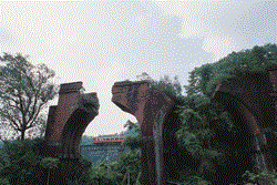 After wheezing past the Shihliufen climb, the old trains came to a sharp descent. Shortly after threading through Tunnel No. 2, which is marked by a plaque inscribed with the words "Opening to Heaven," trains reached the Yutengping iron bridge, once the highest elevation railroad bridge in Taiwan. Known as "a prime example of the Taiwan railroad bridge," it combined brick arch design with widely spaced steel beams. The bridge was badly damaged in an earthquake in 1935, and a new bypass was built, so that the remains of the fractured span, now known as the Lungteng broken bridge, still stand unrepaired.