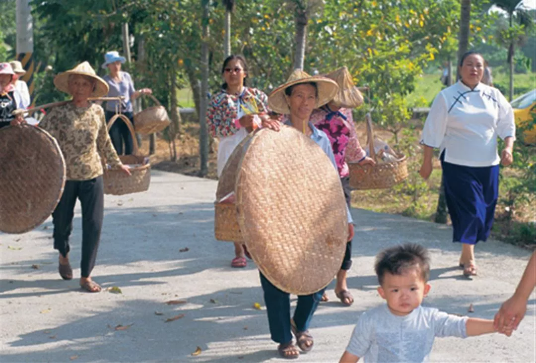 At one o'clock in the afternoon women carrying baskets of offerings over each shoulder arrive. They move towards the irrigation ditch southwest of the shrine. All along are arrayed plates of offerings. The priests have set up a banana leaf altar in the middle of the irrigation ditch. "Banana leaves represent boats on the ocean," says Chang. Aligan vessels are placed on betel nut leaves, having been brought from shrines large and small. Also laid out are buckets of sugarcane leaves in preparation for the climactic rite of Wailing to the Sea.