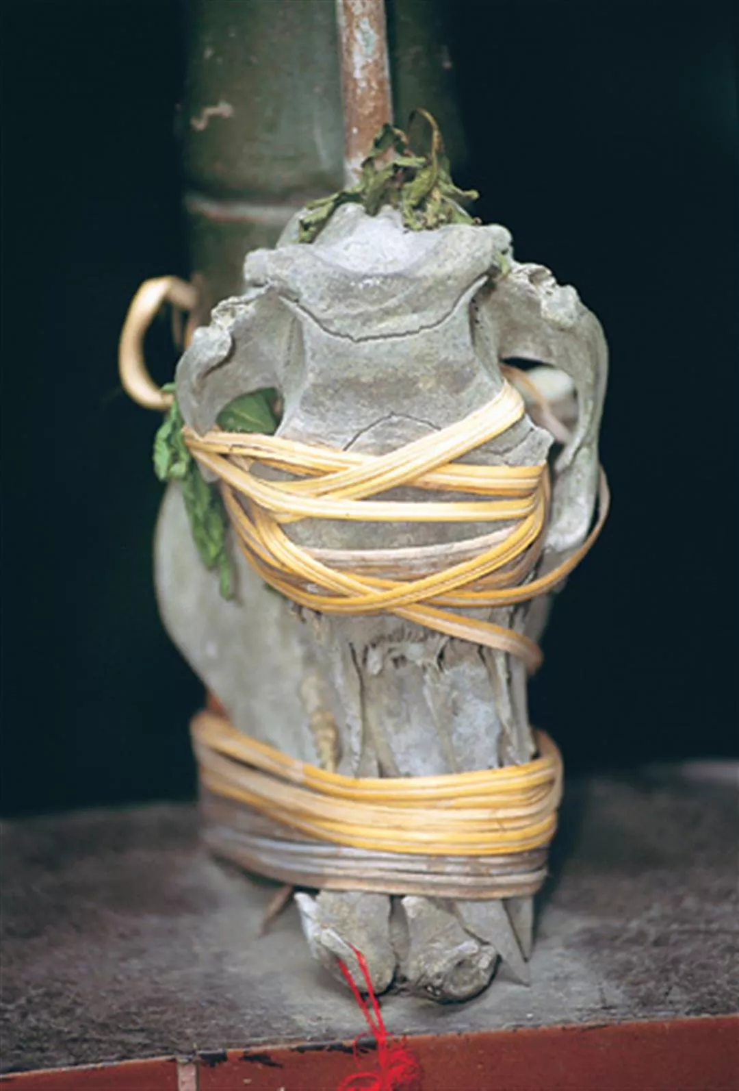 This pig's head strung up in the local shrine is not the typical Aboriginal hunting trophy. Whether it represents some kind of sacred object or sacrificial offering, however, remains a matter of debate.