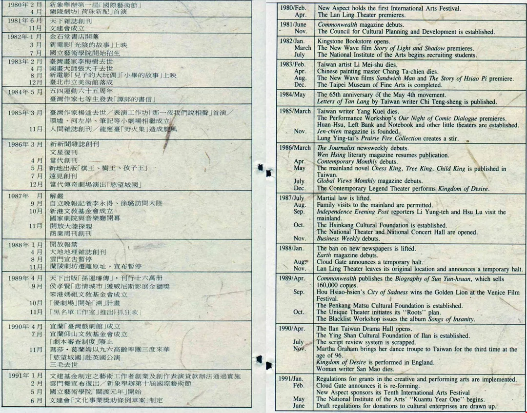 The 1980's were a "great leap forward" in Taiwan's three hundred year history. The political system was liberalized, the economy grew rapidly, and civil society exploded with a vitality that was irrepressible. Given these events, cultural affairs, which had always had a weak foundation in policy terms and which did not get much attention from anyone, were raised up with the tides, mixing with politics, economics, and society, and producing dramatic changes. These changes came in many forms, and it is hard to grasp them all at once. Those who are worried say they are chaotic phenomena. Optimists say that amidst the hurly-burly there is a force leading in the right direction.