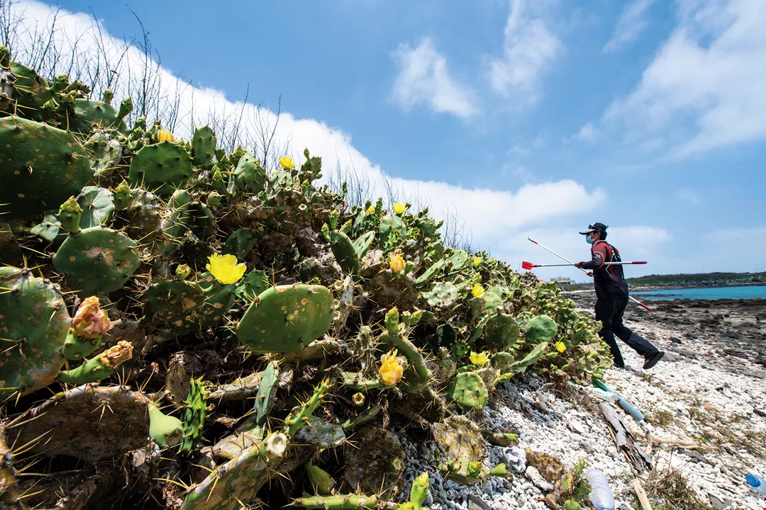 Penghu locals often warn visitors to stay away from the cacti for fear of getting pierced by their fine, hair-like spines, which are almost invisible and very hard to remove. Nevertheless, we see one man standing calm and unperturbed before a group of cactus plants, holding a long-handled steel fork in one hand and a long-handled ladle in the other, looking for targets to “get his hands on.”