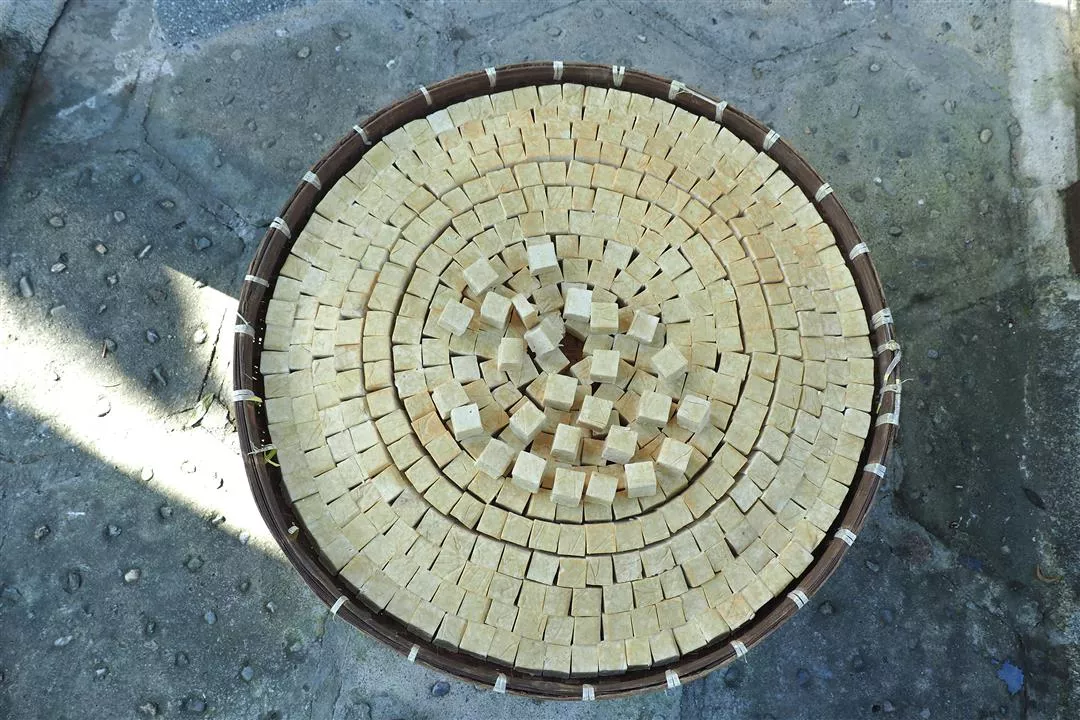 Once the tofu set outside in the sunshine has dried out, it can be used to make fermented tofu.