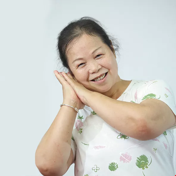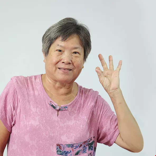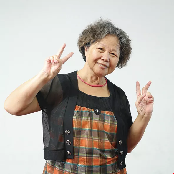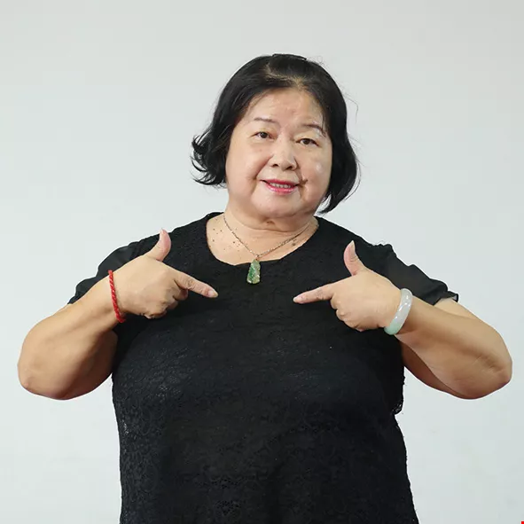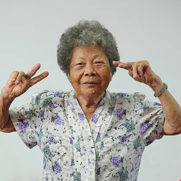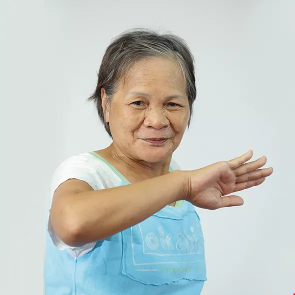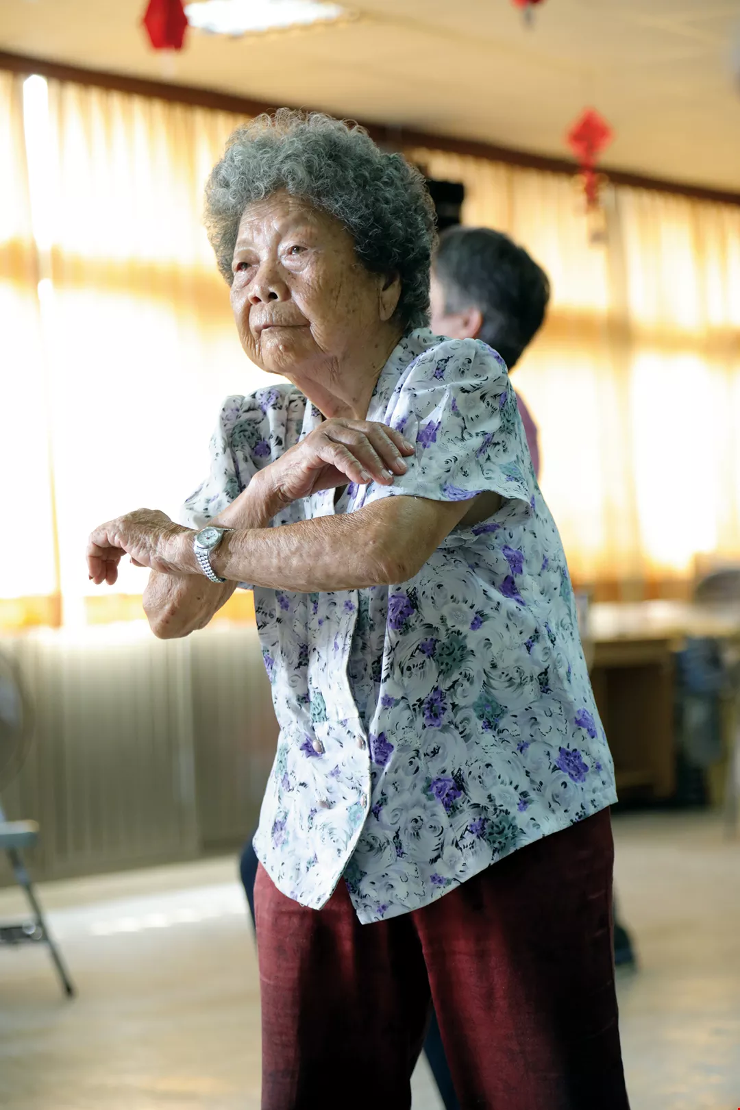 Ninety-one-year-old Wang-Chen Bijin may suffer from frozen shoulders and be unable to raise her arms high, but that hasn’t stopped her working hard to keep up with the rhythm.