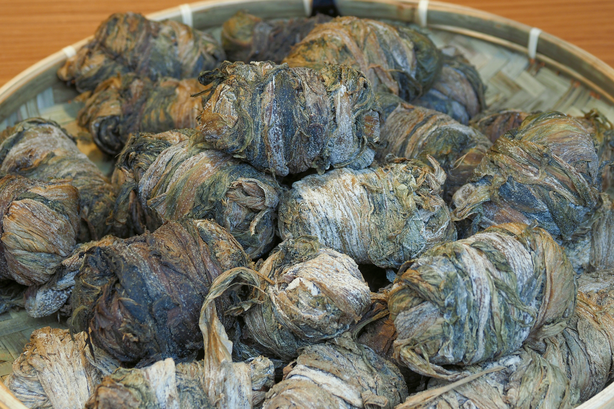 Hakka pickles were created as a way to extend the storage life of foods. Fucai, often used to make soup, is made from mustard greens by adding salt and kneading to remove water, pickling them in an earthenware vat, then drying them in the sun. Depending on the pickling time, different pickles can be made from the same kind of vegetable. For example, mustard greens can be made into fucai, xuelihong, and meicai. “Mustard greens start with an astringent taste, but they take on a unique fragrance after being pickled.” Another returnee from the city, Chen Mu Chan, who grew up in Hengshan Village, recalls how when she was small every family had a big vat and stones. The adults would press the vegetables down with their feet until they had squeezed out all the air from between them, and then place large stones in the top of the vat.