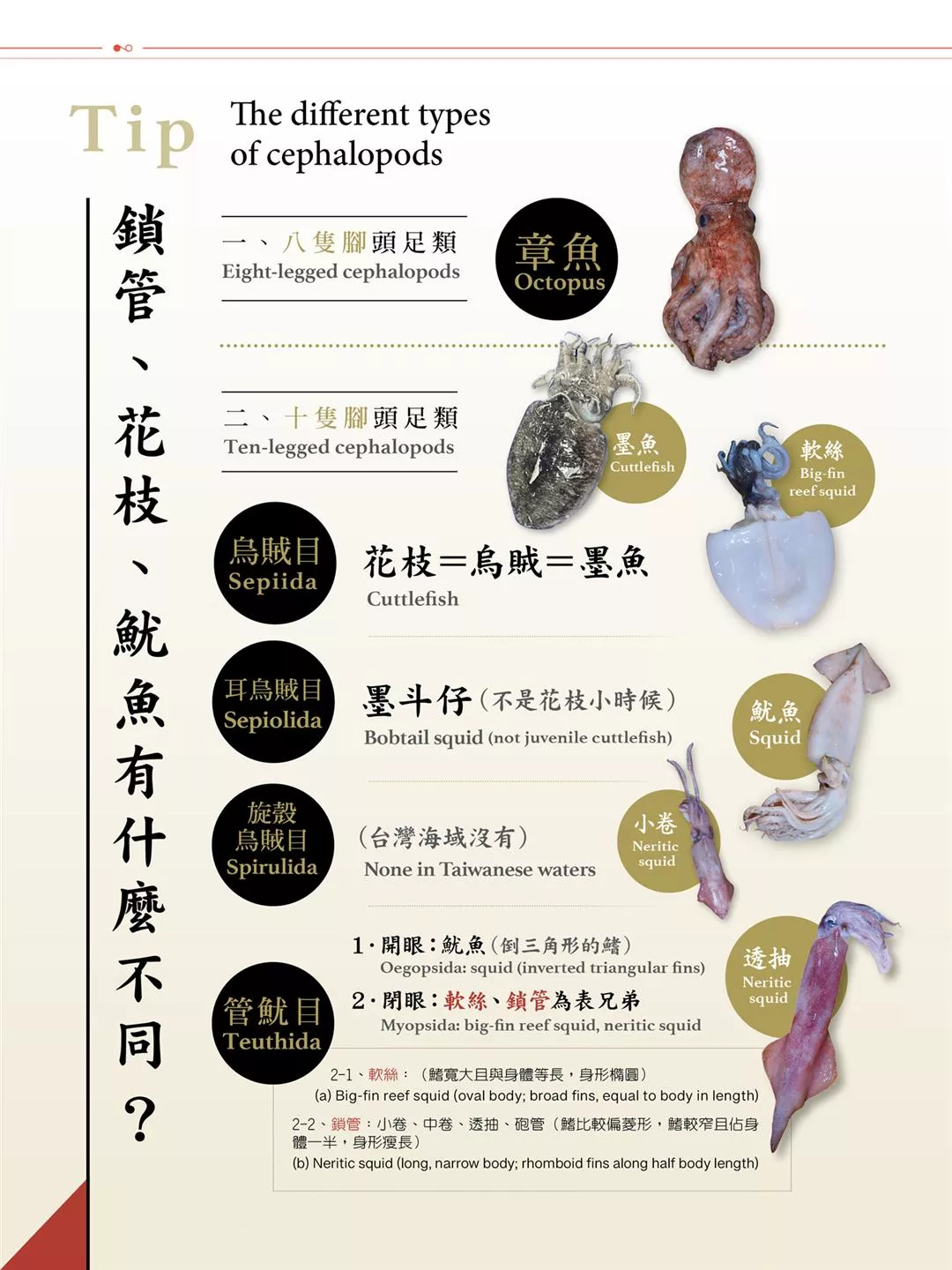 The academic community divides neritic squid into species such as swordtip squid (Uroteuthis edulis) and Indian squid (U. duvaucelii), but Taiwan’s fishmongers take a different approach. They have adopted names to distinguish the sizes and prices of these cephalopods. The largest (over 40 centimeters in length) are known as paoguan (cannon barrels), while those of 20–40 cm are known as touchou, those of 15–20 cm zhongjuan (medium rolls), and those below 15 cm xiaojuan (little rolls). The smallest, roughly 2–7 cm in length, are called mimijuan (mini-rolls), and are mainly processed into XO sauce (a spicy seafood sauce).