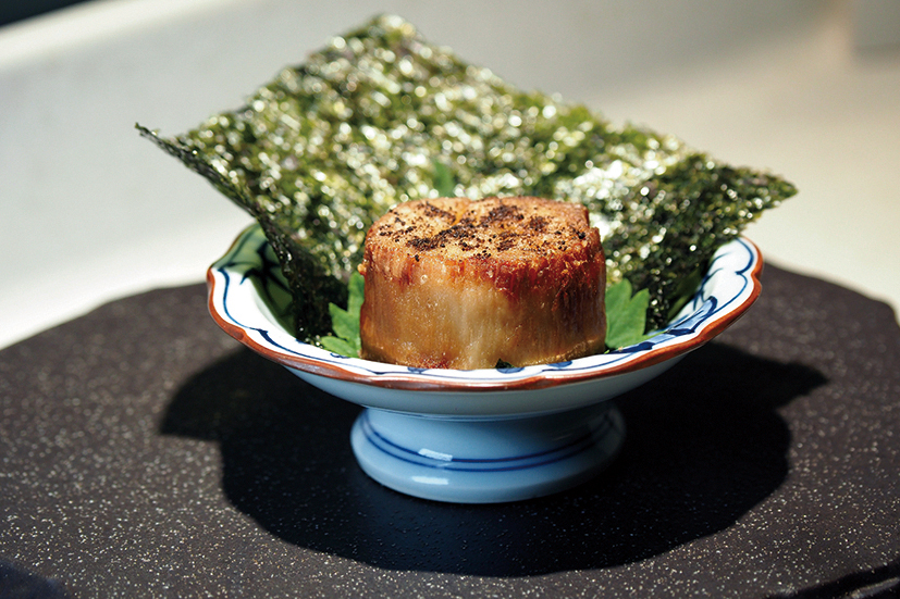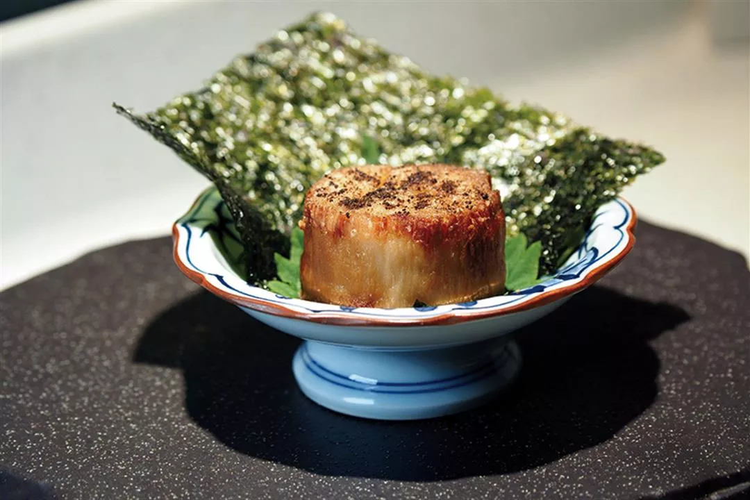For pan-fried scallop with seaweed and perilla, knife work and ingenious cooking techniques are employed to subtly harmonize the flavors of the ingredients.