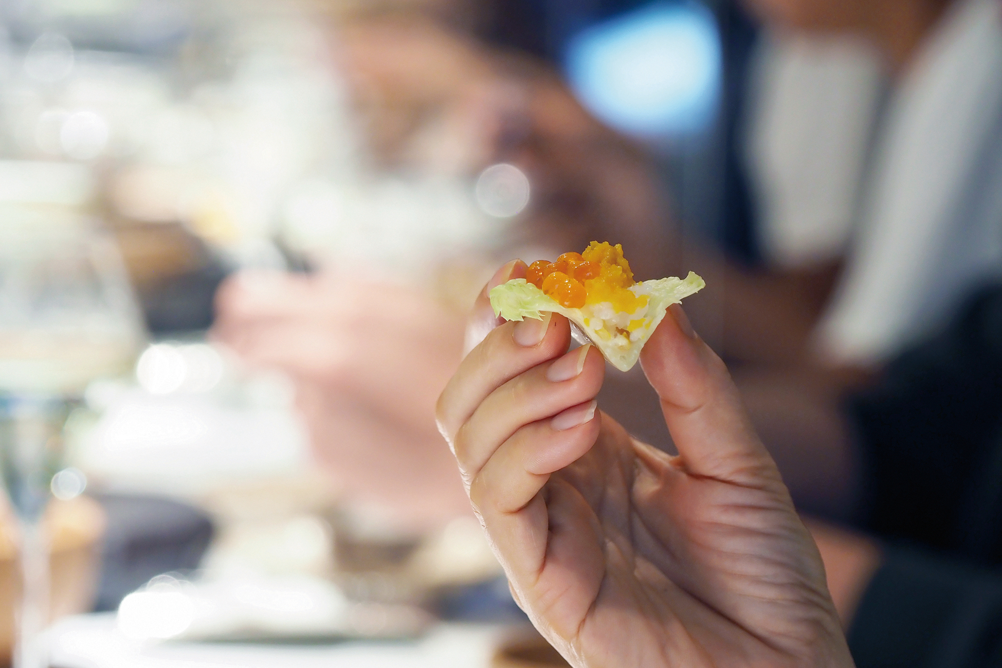 The chef also employs some clever ideas to enrich the taste of the dishes. One example is to serve “tuna” with avocado salad, using the fat in the avocado to compensate for the lack of it in the red pepper. Another is to strengthen the aroma of “billfish” by broiling it. Meanwhile, perilla leaf is added to pan-fried “scallop meat” to dispel the oiliness of the scallop, and then truffle powder is added to increase the seafood fragrance and compensate for the absence of a browning aroma in plant-based ingredients.