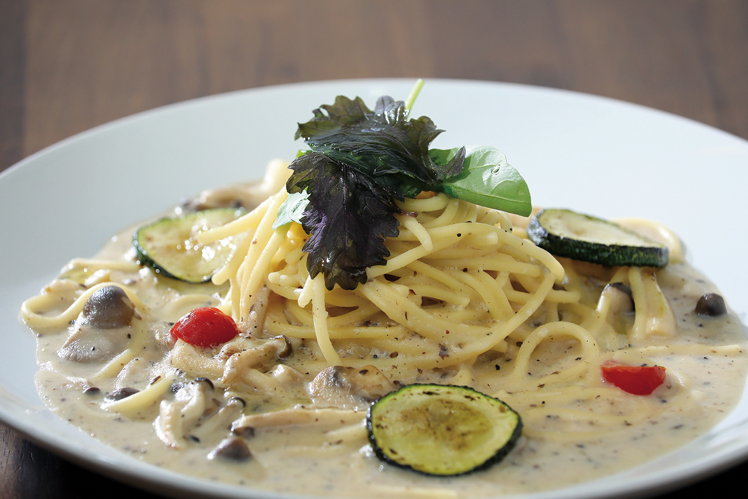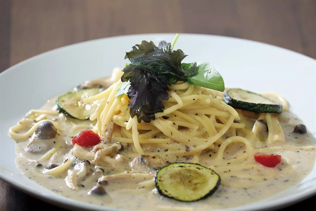 Vegan spaghetti with truffles and cream sauce is made with flour and potatoes in place of fresh cream and cheese, but still offers a rich flavor.