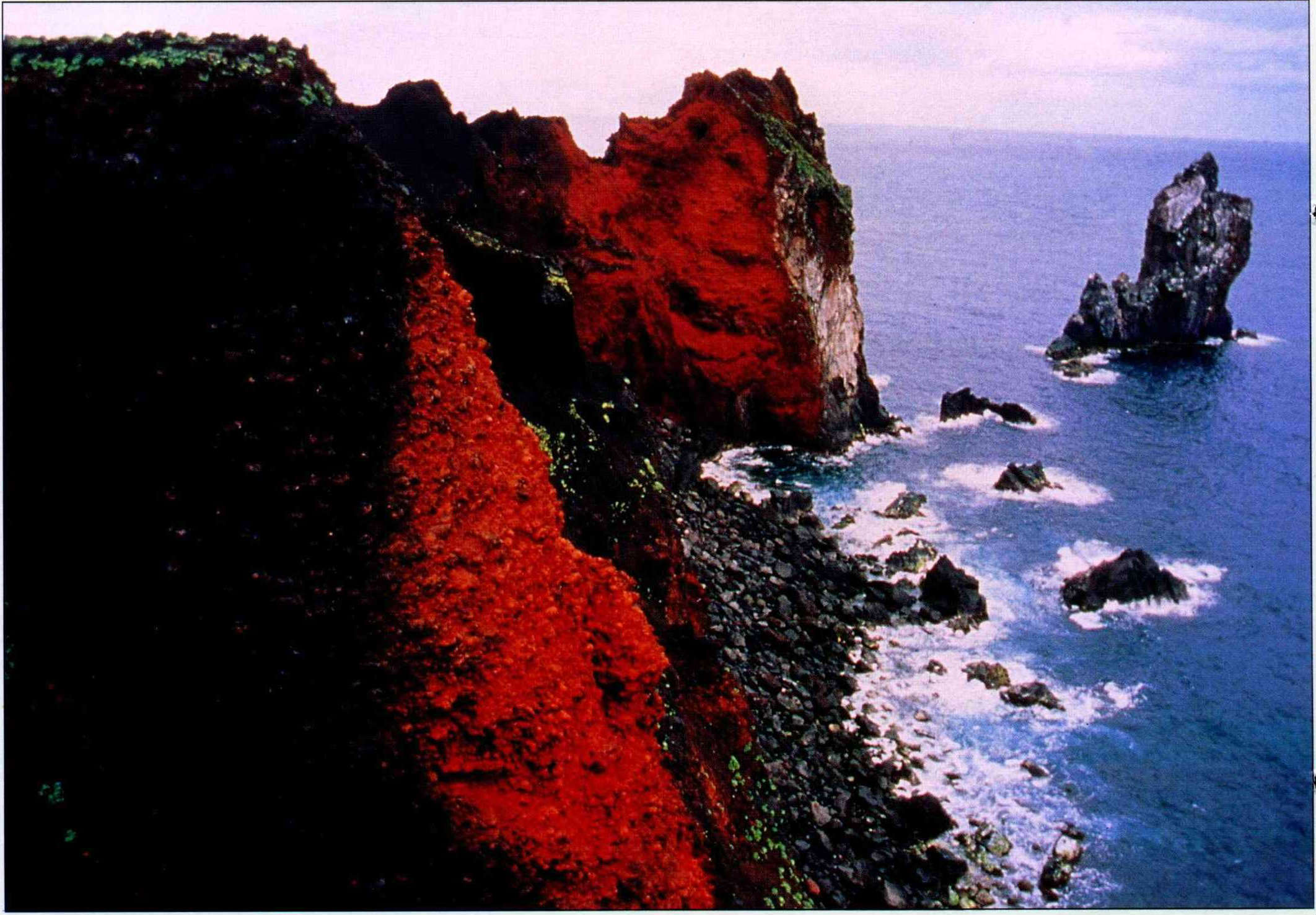 At the start of the year, the Council of Agriculture made a nature preserve out of three small islands off the coast of Keelung that are the only spots in northern Taiwan where sea birds propagate. The photo shows Huapingyu, on e of the three islands. The island is covered with volcanic sand that ha s a high content of iron, which has oxidized. It makes the island look like it is being bathed in the red light of a sunset. (courtesy of the Keelung Bird Society)