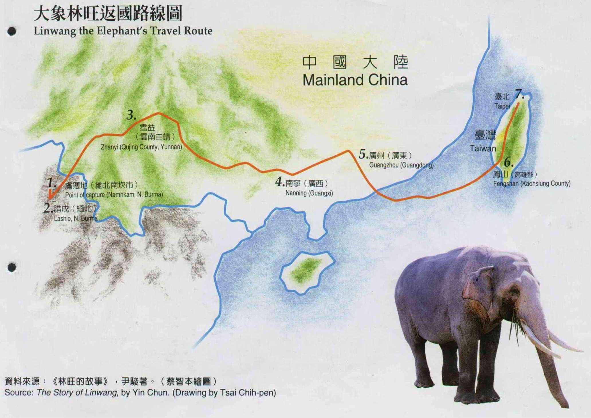 Linwang the Elephant's Travel Route Source: The Story of Linwang, by Yin Chun. (Drawing by Tsai Chih-pen)