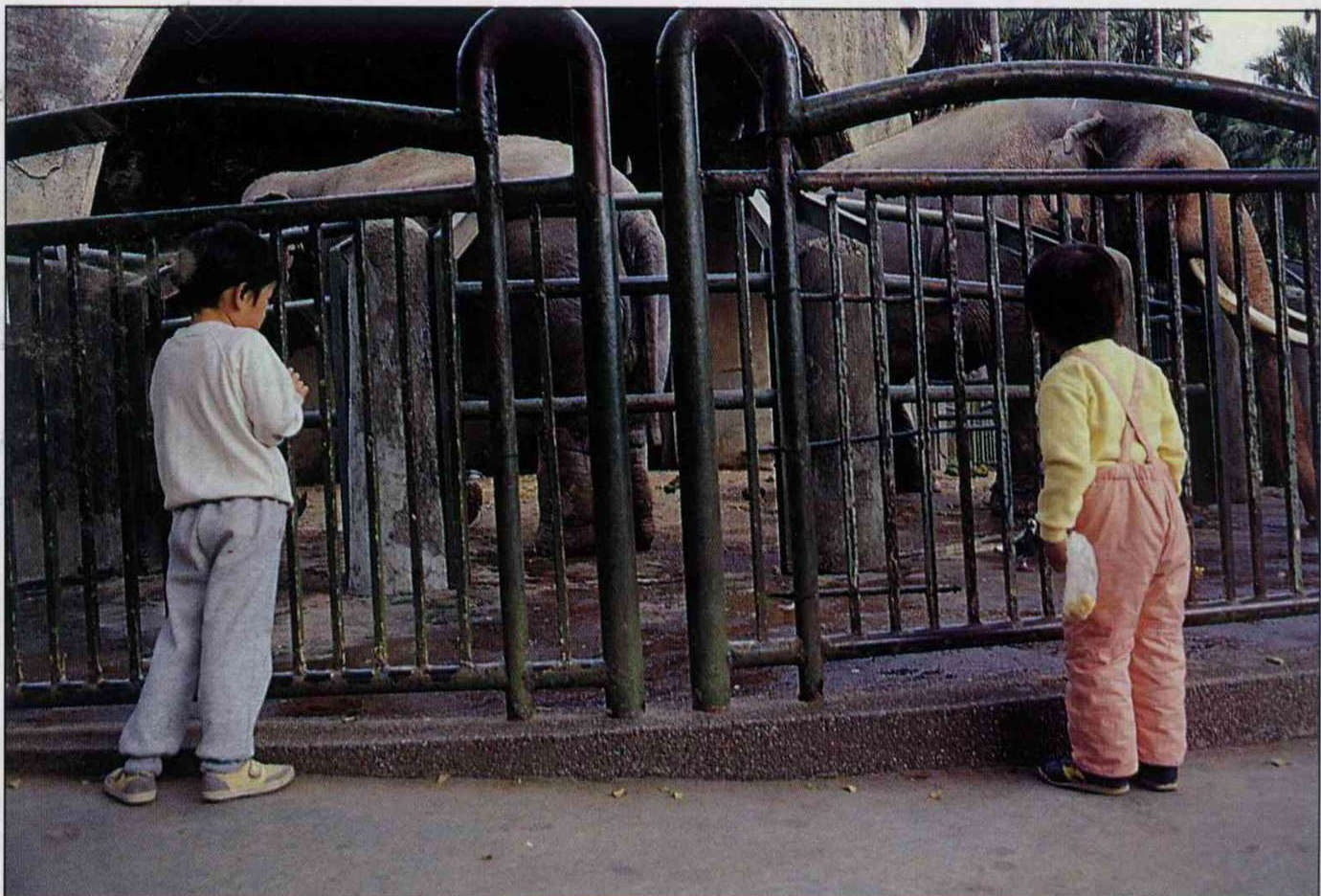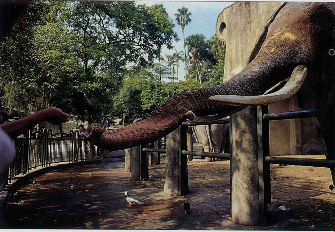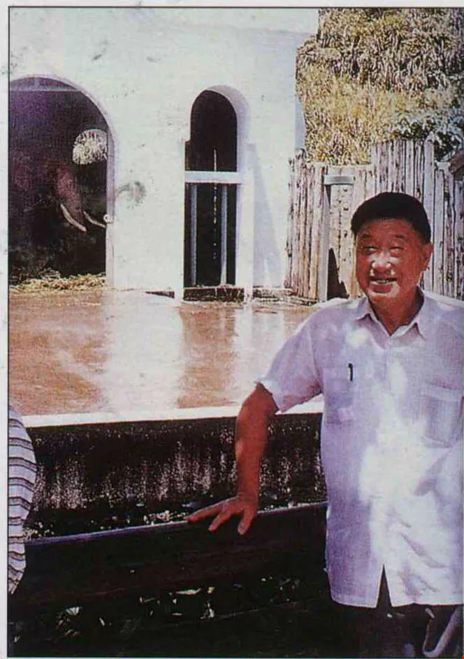 During Linwang's big 66th birthday celebration, Lan Wei-chiang especially brought his metal teacup, rushing from Tungshih, Taichung County to see his pachyderm pal again. He filled the cup with popcorn, and standing in front of the railing, lifted it up high. Linwang quickly walked forward, and twisting his trunk, transported the popcorn into his mouth. "When I saw that his head was all shiny and bald, and he moved so slowly, and he was covered with age spots, I felt so sad. Ah! He's old, he's all used up."