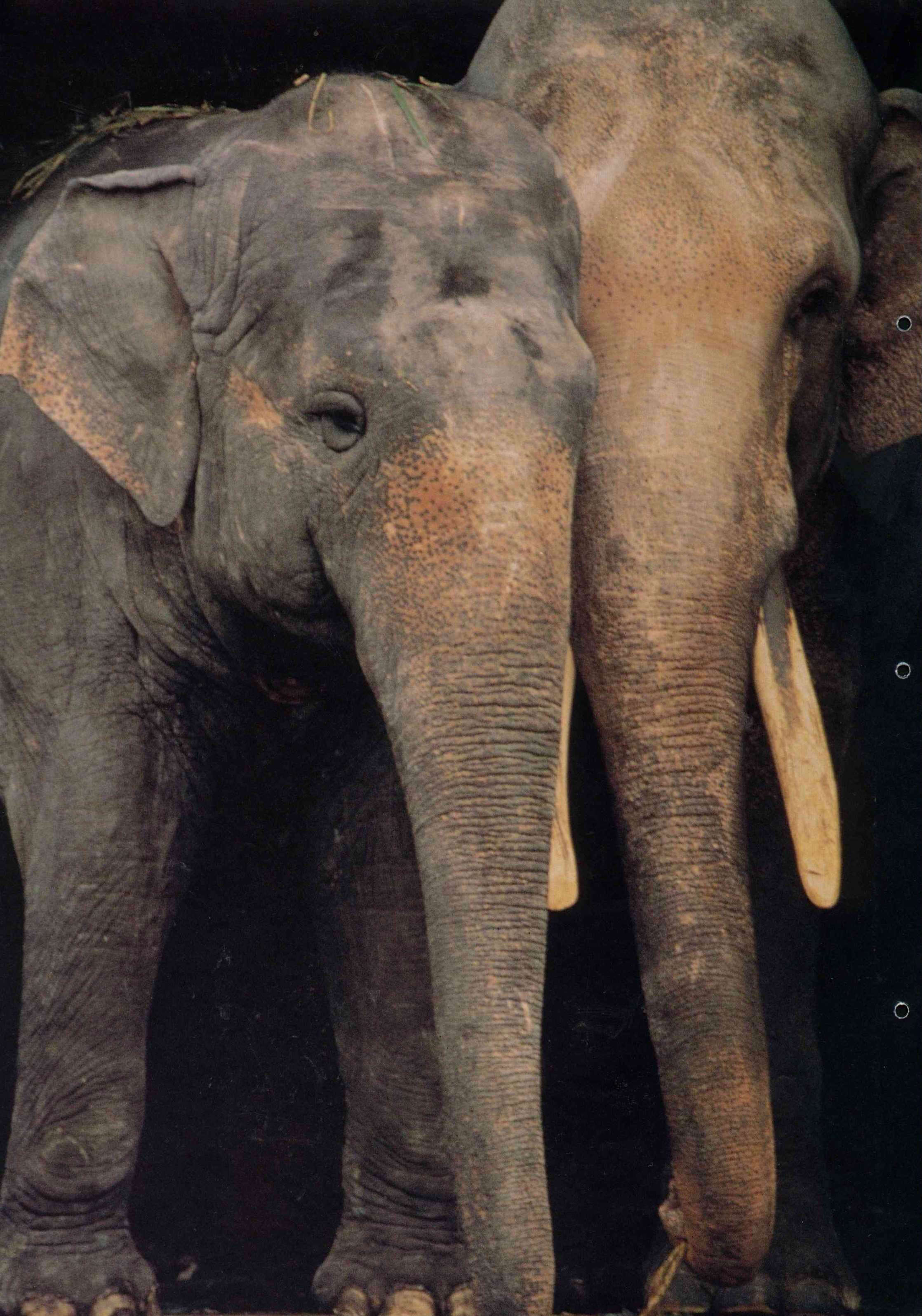 The bride and groom grow old together. Elderly Linwang, who spent his youth assisting young Chinese soldiers in World War Ⅱ, peacefully enjoys his waning yea rs in the zoo. He is the one on the right with tusks. (photo by Cheng Chih-wen)