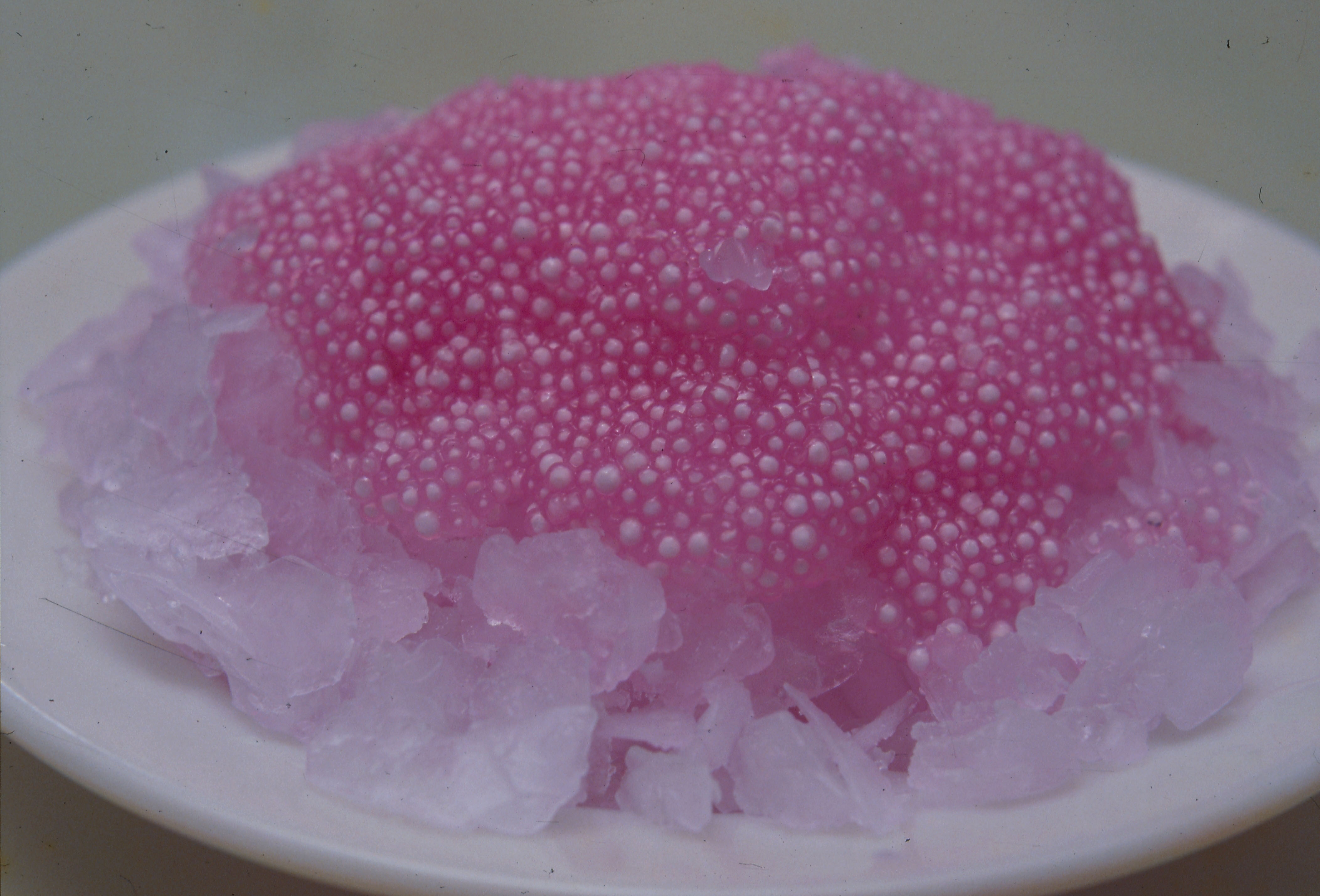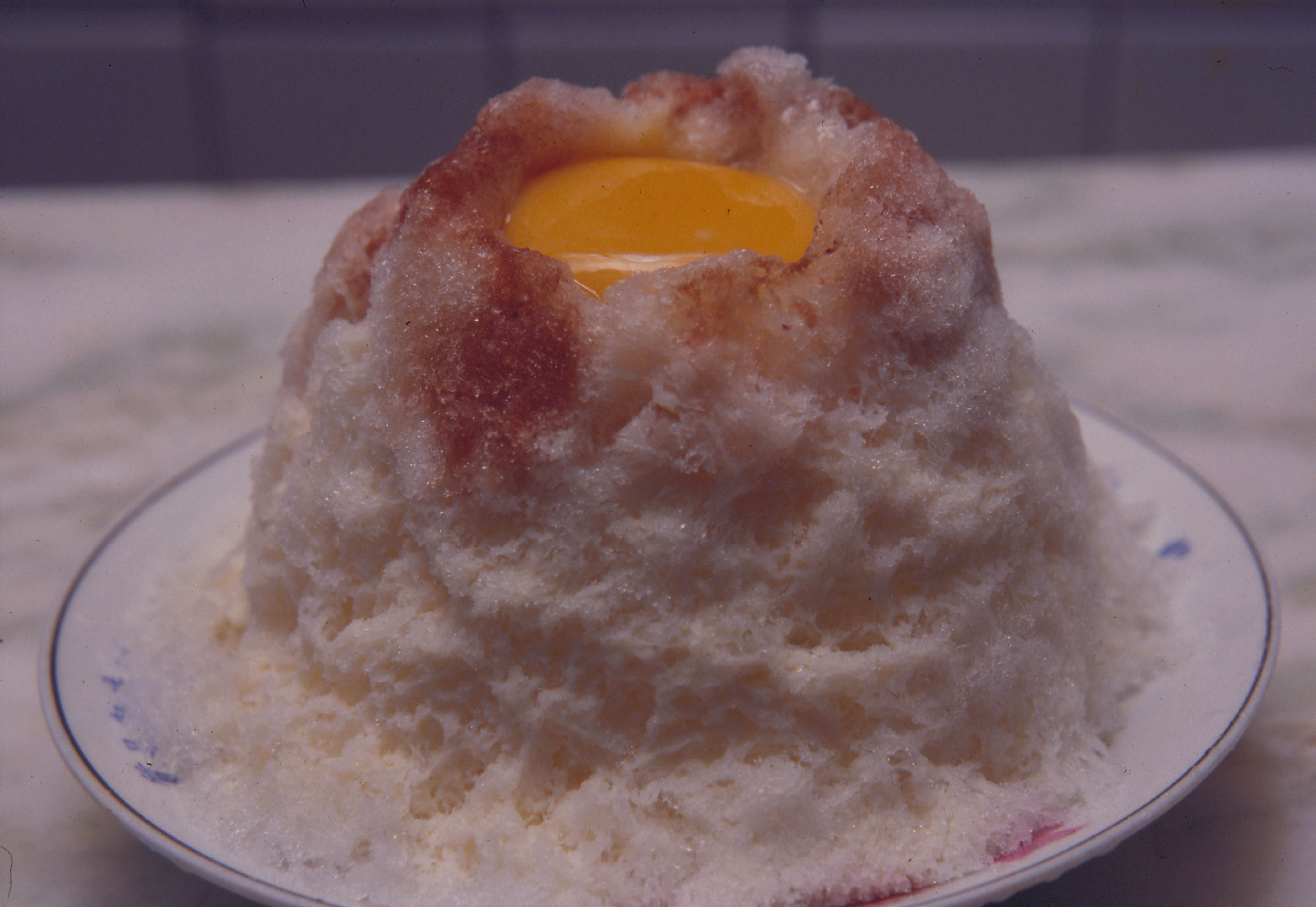 Recently, there have been several changes in the form of the ices. In particular, the juice and the ice are often shaken or whipped together. As people have become more artistic, molded ices have appeared. A typical example is the "sighting of the moon" ice which is made in the shape of a cone from ice flavored with chocolate and milk, with the yolk of an egg placed in the middle. The "rocket capsule" is made by piling ice high with pudding mixed in. The "snowy mountain with a red peak" is a mountain of ice topped with strawberries.