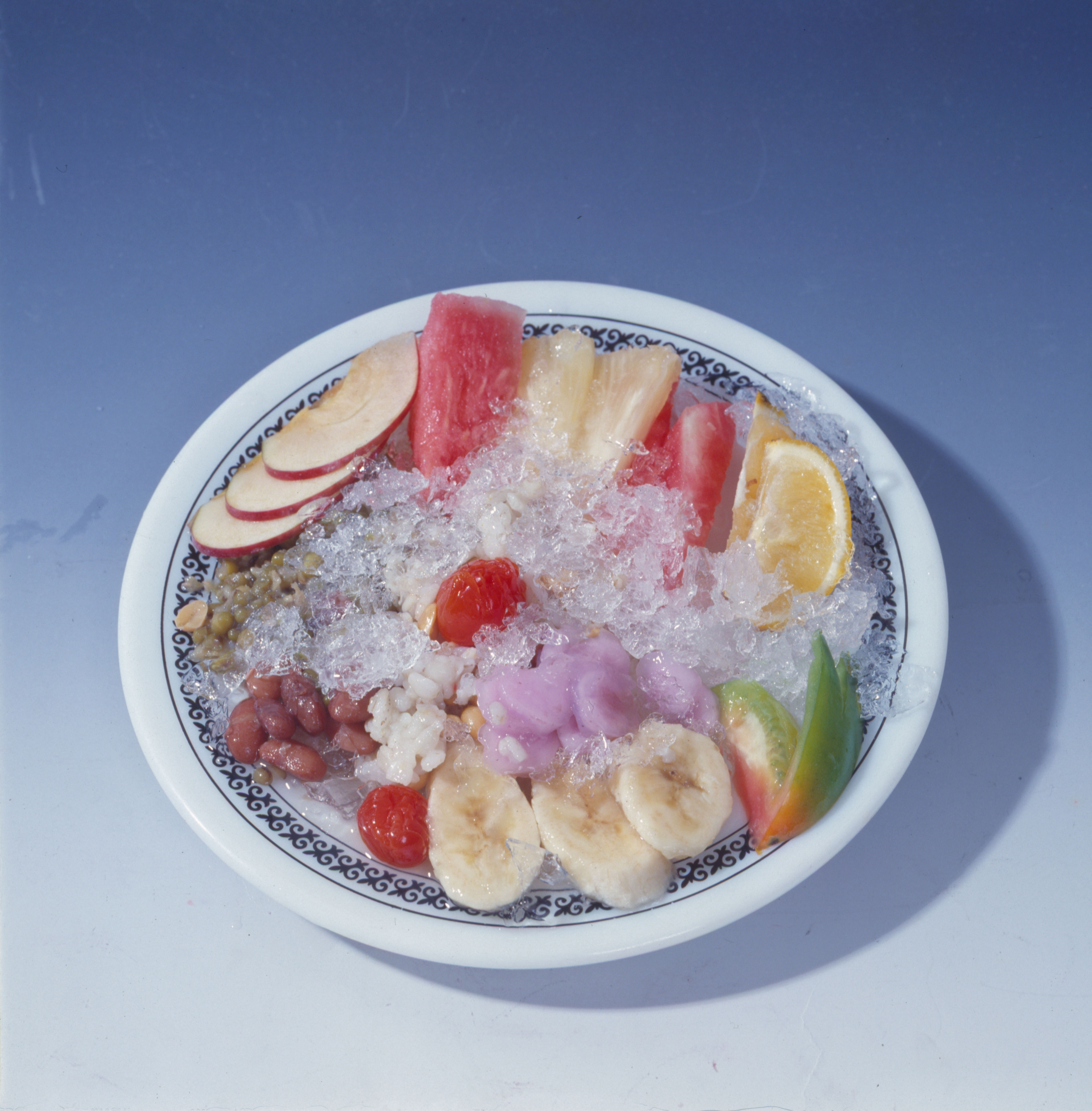 A traditional Chinese scraped ice dessert consists of three main ingredients: the ice, sugar syrup, and flavorings such as fruit, beans and vegetables. The most popular are the mixed fruit ices, and the "Eight Treasures Ice" which saves people from having to make a choice of flavorings.